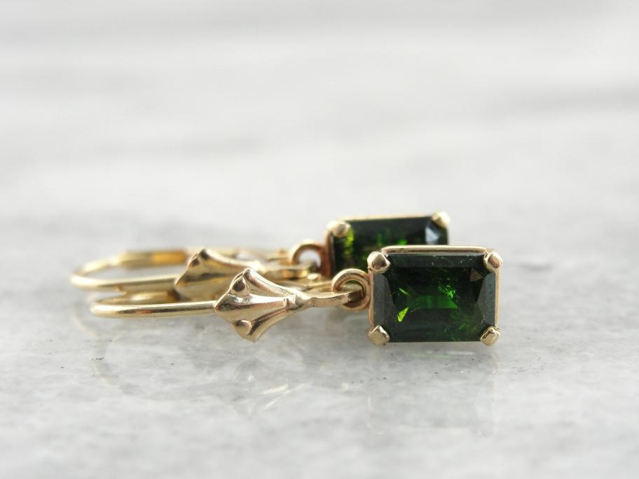 A hard to find combination of size and rarity bring inordinate value to these gorgeous gemstones. Perfectly cut in to simple rectangles that retain incredible glitter and depth of color, these rare Demantoid Garnets are luxurious and still versatile. Open back mountings allow plenty of light in to these incredible gems, while small gold accents provide a bright accent near the ear.