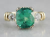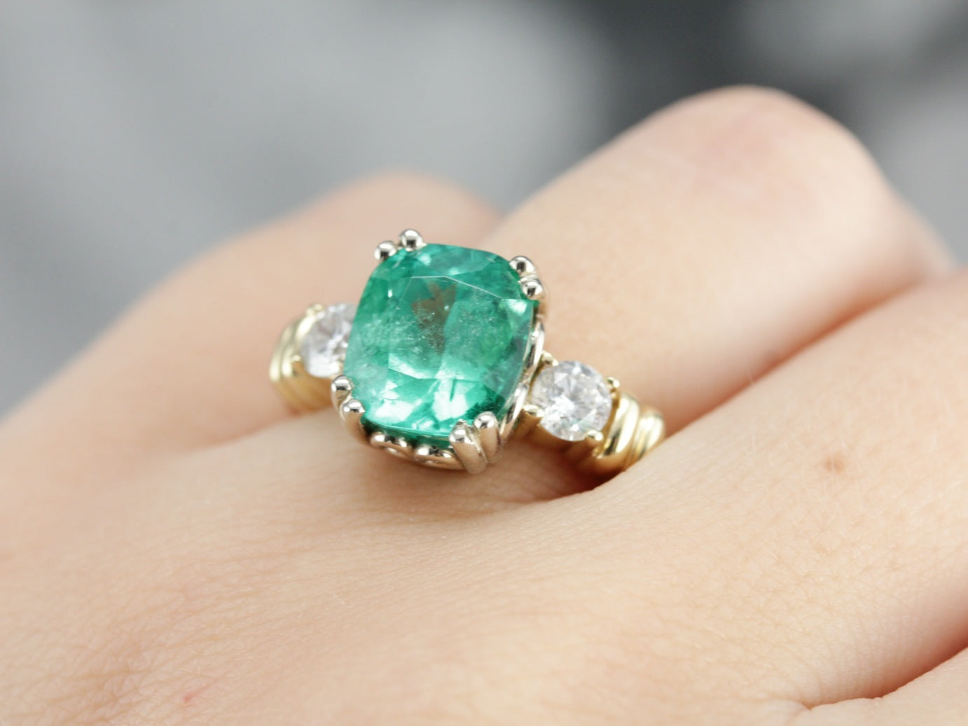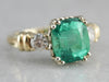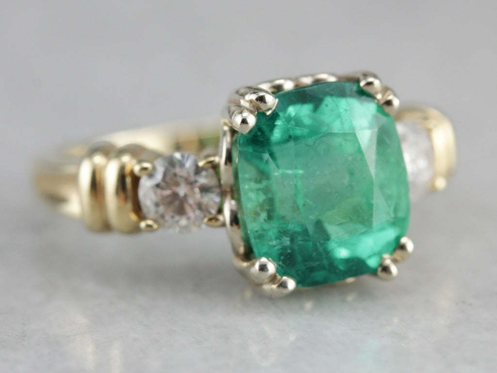 Metal: 14K Yellow and White Gold Gem: Emerald 3.67 Carats Gem Measurements: 8.9 x 10.1 mm, Rectangle Cushion Cut Accents: 2 Diamonds totaling .46 Carats, G in Color, SI3 in Clarity Ring Size: 7 GIA Report Number: 123**********