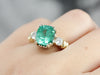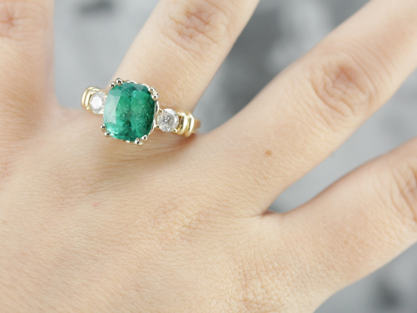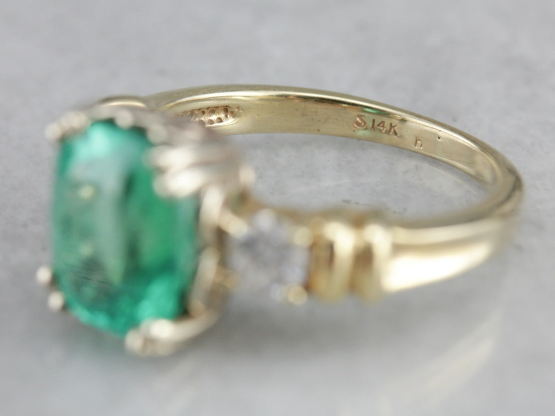 This emerald and diamond ring makes a perfect engagement or anniversary piece. This is one of our finest emeralds currently in stock! This is a rare and valuable example of emerald, purchased in Colombia on one of our more recent gem hunting excursions. The color is an intense, glowing deep green, with highlights of mint and low lights of rich teal. The light coming from this stone is unbelievable, thanks to both the wonderful cutting and the rare clarity of this high-end gemstone. We've set this piece in a handcrafted setting of 14-karat yellow gold. Bright diamonds accent the shoulders, giving this substantial ring a bit of sophistication.