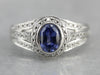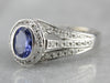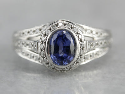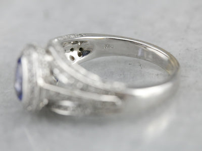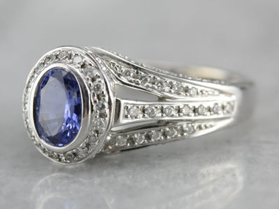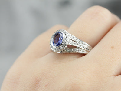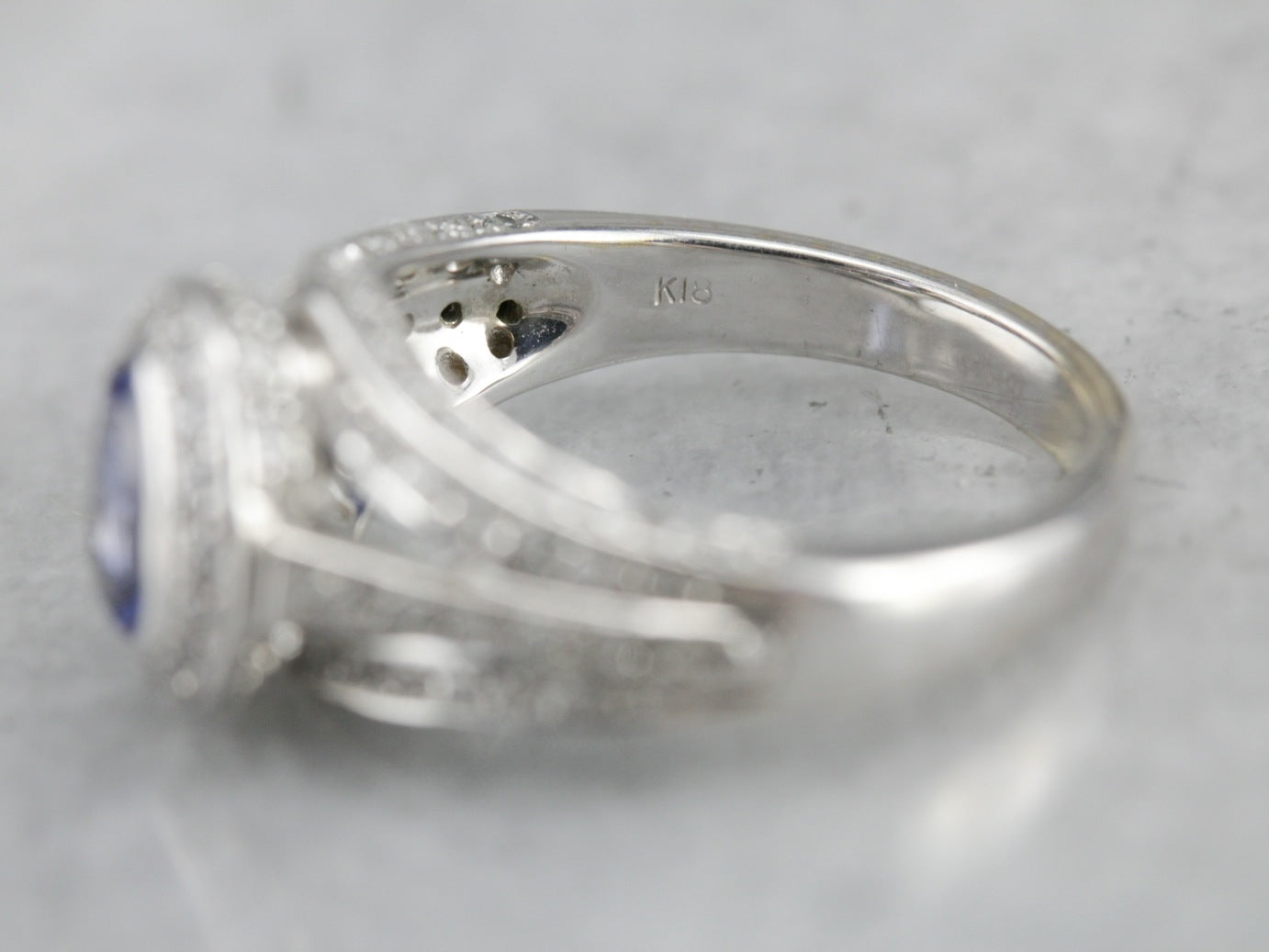 Another easy to wear ring, this one would make a spectacular engagement piece. This is 18k white gold, very well made, paved with diamonds on three sides. The center stone is Tanzanite, a bright purple oval with plenty of sparkle.
