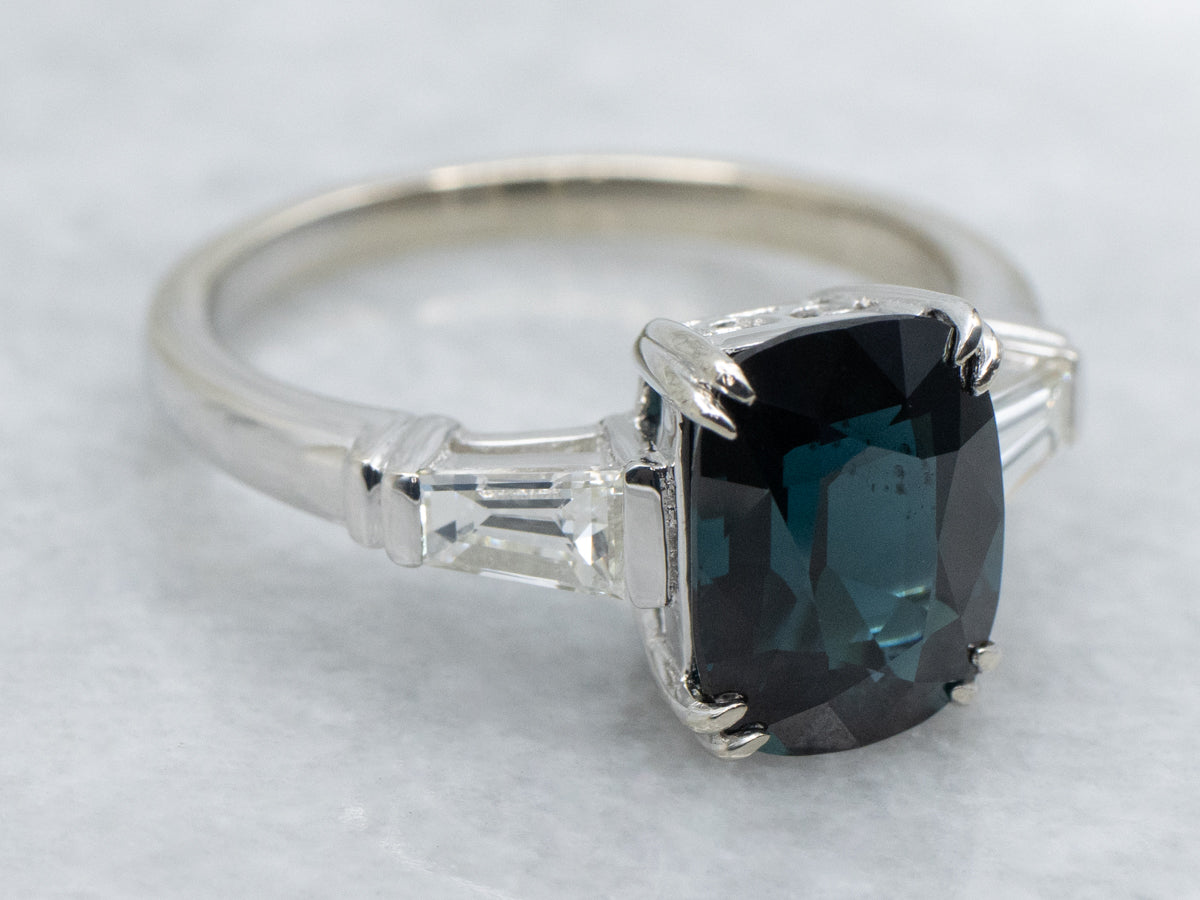 Discover the captivating allure of this exquisite white gold ring, where a stunning newly set blue spinel takes center stage with its mesmerizing cushion cut. The rich, velvety blue tones of the spinel are beautifully complemented by delicate baguette-cut diamond accents that frame the center stone with refined elegance. Crafted in lustrous 14K white gold, this piece seamlessly blends timeless sophistication with contemporary design, making it an ideal choice for those who appreciate gemstone jewelry with distinctive character and refined taste.