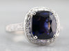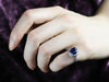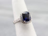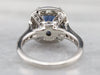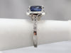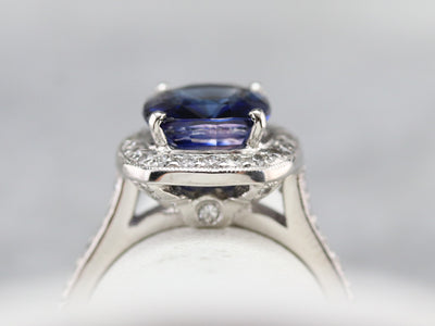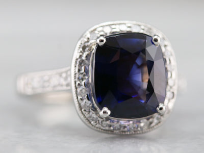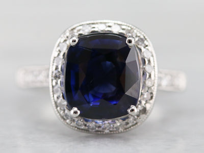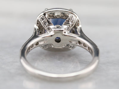 This Ceylon sapphire ring would make an incredible engagement piece! Refined and elegant and yet eye-catching, this ring relies on the quality of materials to establish value. In the center, a glowing, deep blue Ceylon sapphire sits, a classic midnight hue. Surrounded by a cushioned halo of pavé diamonds that glitter in the light, there is a small diamond set into the undercarriage on each side as well; a little hidden surprise!