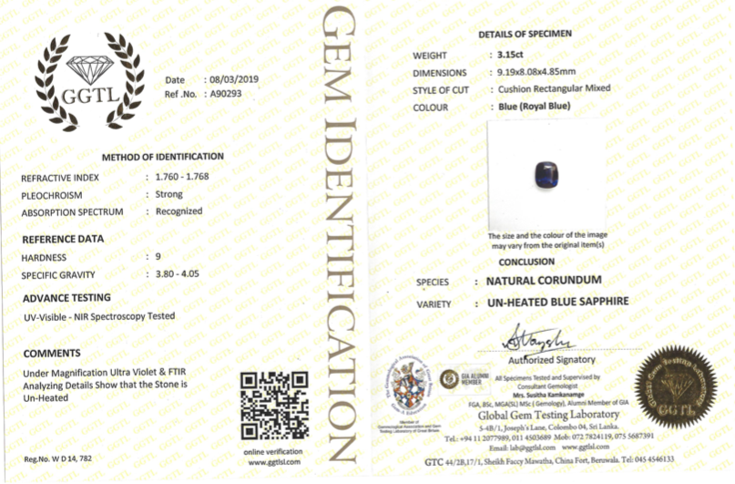 Metal: Platinum Gem: Ceylon Sapphire 3.15 Carats Gem Measurements: 9.1 x 8.0 mm, Cushion Cut Accents: 48 Diamonds totaling .48 Carats Ring Size: 4.75 Marks: "PLAT" Stamped on the inside band GGTL Report Number: A90*****