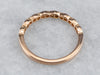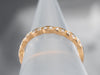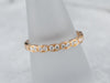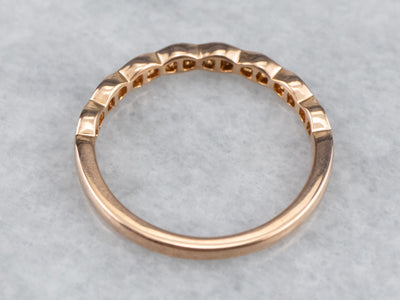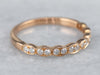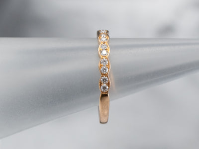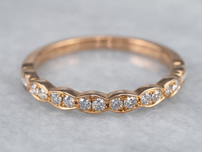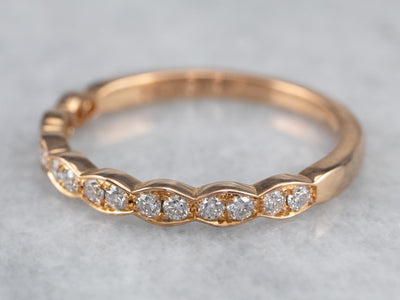 This diamond and rose gold wedding band has a sweet femininity thanks to an undulating marquise design. A pair of diamonds accents each shape, twinkling amongst the glowing rose gold. This band would also make a stylish stacking band or anniversary ring!