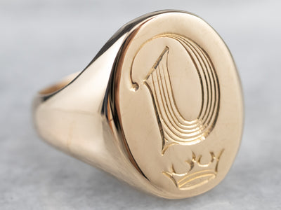 Bold and stylish, this unisex signet ring is inscribed with the letter "D" and a regal crown. Crafted of 14 karat yellow gold, with a perfect polish, this vintage piece is ready to wear or gift!