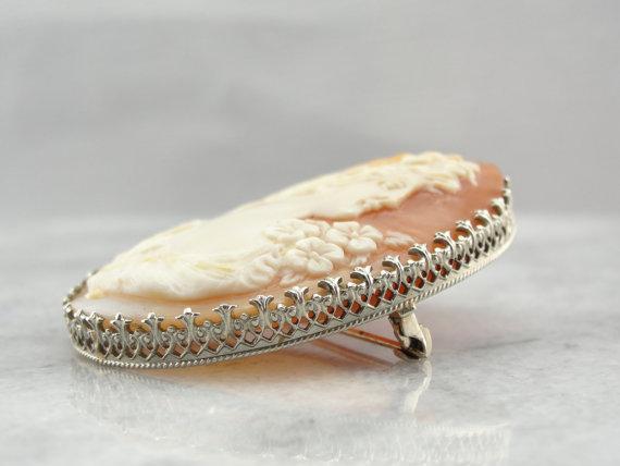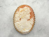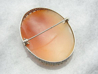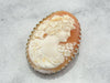 This is a carved shell cameo featuring a lady in profile with grape leaves draped across the chest and shoulder of her dress. The shell is deep salmon with cream top and done in exquisite detail! The decorative filigree in the prong work frame creates the perfect, feminine accent for this lovely lady.