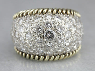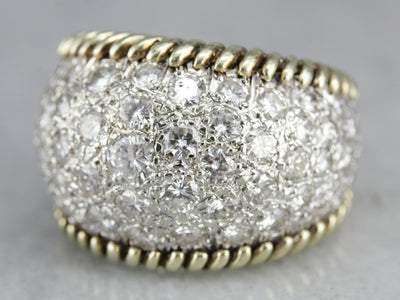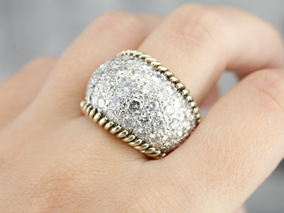 The simple design of this ring is what saves it from being over the top, and keeps it as a classy, sophisticated piece. Encrusted with bright, sparkling diamonds which sit flush to the mounting, creating a showstopping effect! There is simply no space on this slightly nautical themed, easy to wear piece, that is NOT covered in diamonds!