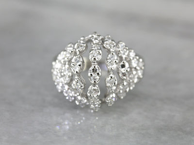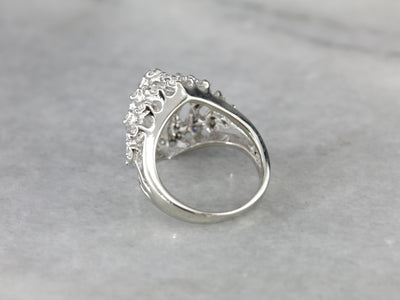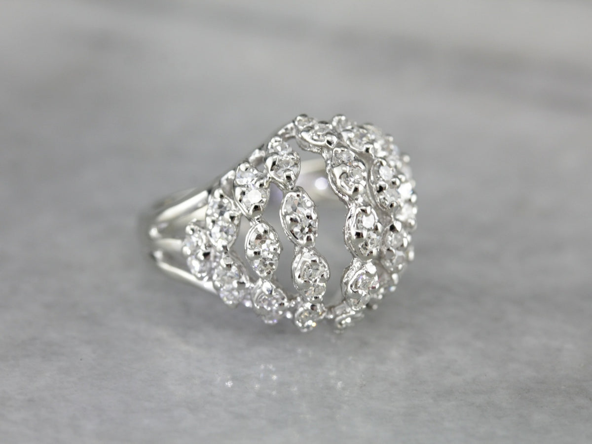 This vintage, cocktail ring features a gleaming array of diamonds orbiting around and open work center. This is a wonderful combination of sexy and yet sophisticated, easy to transfer from office to evening. Perfectly proportioned and very well balanced, this vintage cluster ring is bold but comfortable!