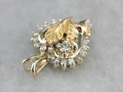 A sweet Victorian leaf is given new life in this one of a kind pendant! We've set this gorgeous little gold piece on to a new frame. The diamond behind the leaf contrast the soft hue of the gold to perfection!