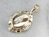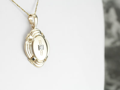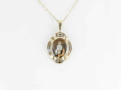 Stepped curves and a high polish make this pendant shine from every angle. At the center is a sparkling diamond of exceptional clarity, set in contrasting white gold. The pearl enhancer style bail allows you to attach this pendant to a variety of necklaces.