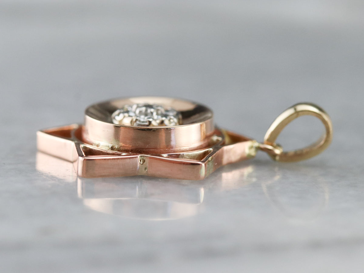 Metal: 14K Yellow, Rose, and White Gold Gem: 7 Diamonds totaling .14 Carats, VS in Clarity, G in Color Gem Measurements: 1.5 mm, Round Measures: 18 x 25 mm, with bail