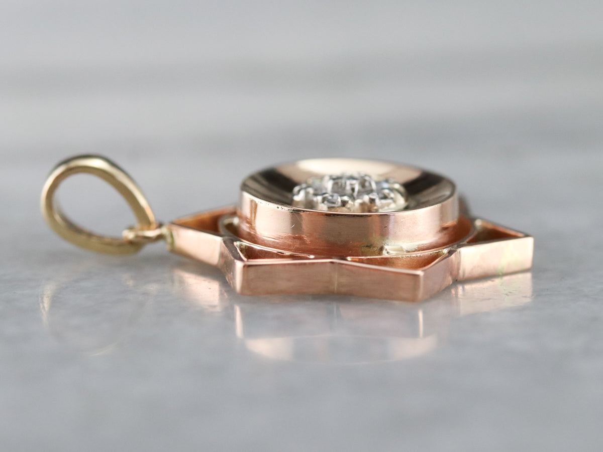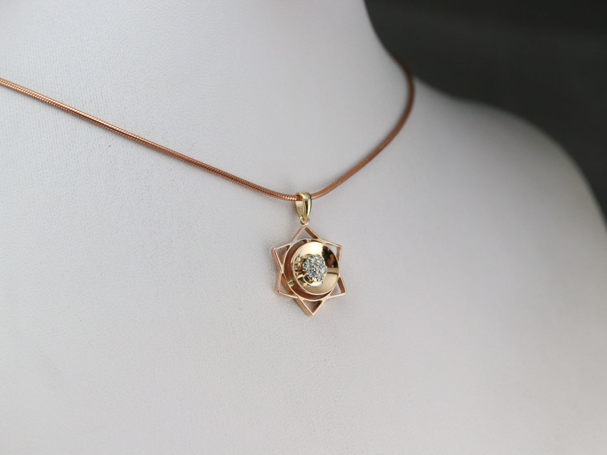 This diamond gold star pendant is full of light! Crafted from three different shades of gold, this six pointed star is made in an openwork design with a high polish. A cluster of diamonds is set at the center, adding plenty of sparkle to this wonderful piece.