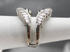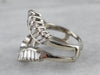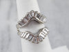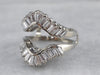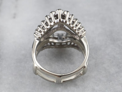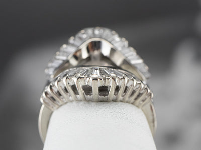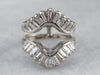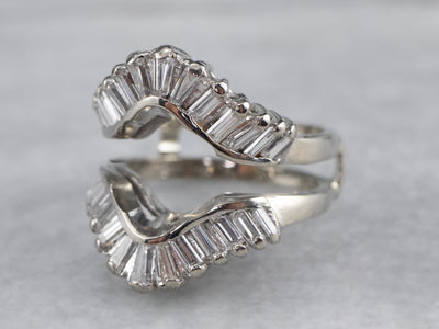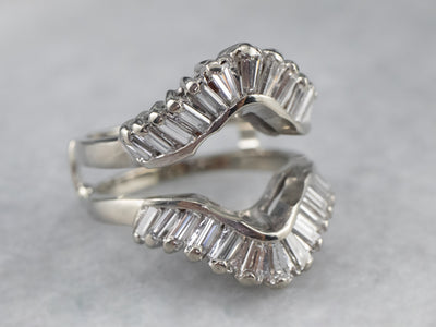 Crafted of bright, white gold and glittering baguette high-quality diamonds, this vintage ring has a lovely, refined profile on the finger. Open in the center, this can be set with a solitaire gemstone ring of any color to create a wonderful frame for a simple ring.