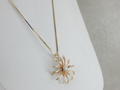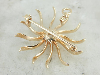 So beautiful! This pretty antique gold brooch is set in the center with a bright diamond. Absolutely stunning, this piece is a classic that will be a favorite for decades to come; a great pendant to wear alone or layer with other pieces. Alternatively, this can be worn as a brooch, a lovely size for blouse or jacket lapel.