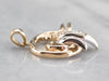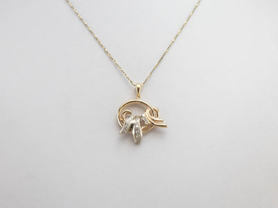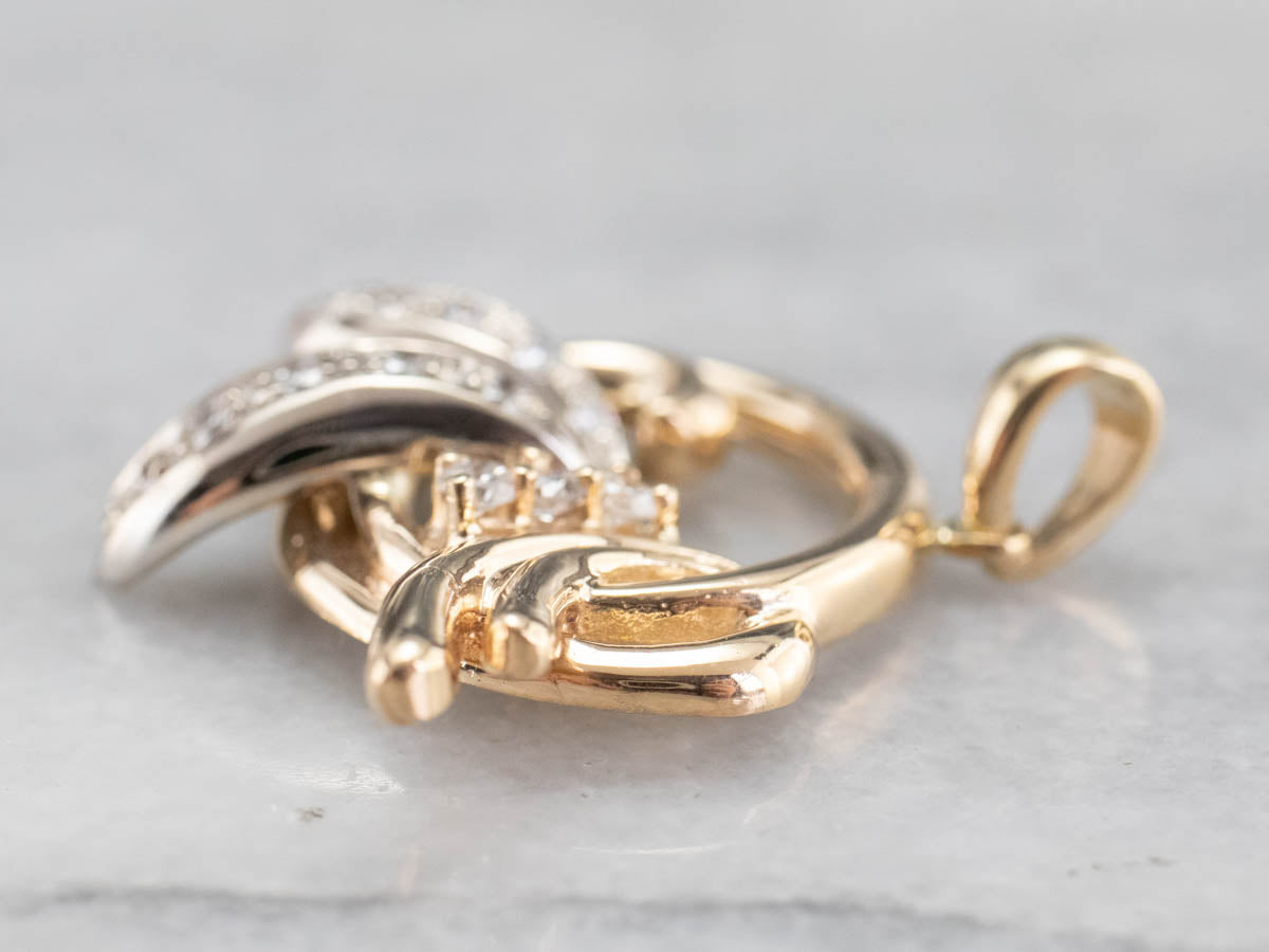 Scrolling pieces of yellow and white gold form an organic motif in this stunning diamond pice! Crafted of both 14 karat yellow and white gold, this is a fantastic piece, easy to wear with a variety of chains and metals!