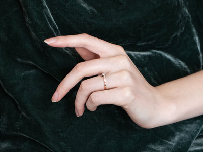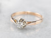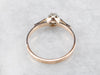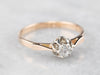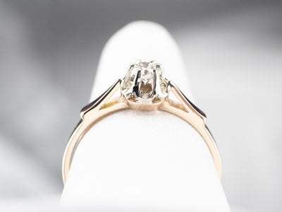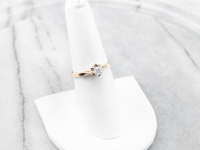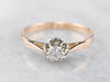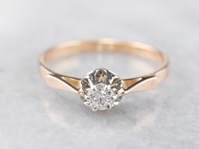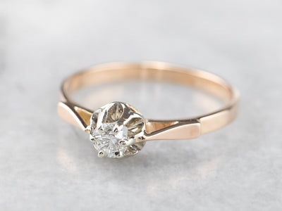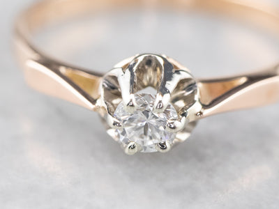 Diamond solitaire rings such as this one are timeless and perfect for everything from engagement to anniversary! The buttercup setting protects the diamond with a beautiful flower-like frame, crafted of 14 karat white gold. The mounting is Russian rose gold, a unique shade that is beloved by many!