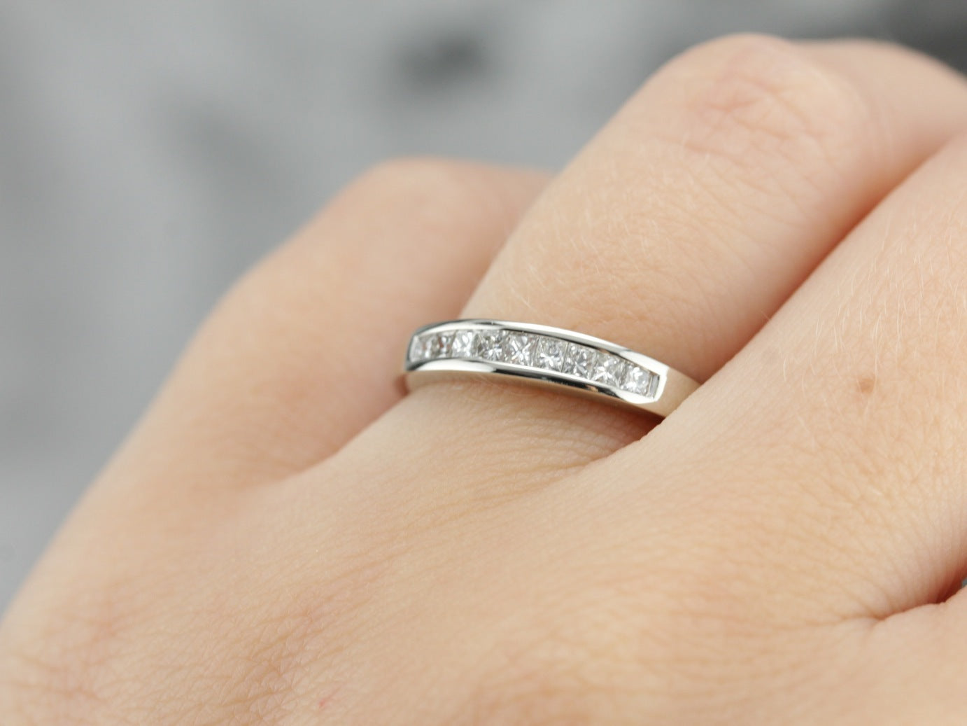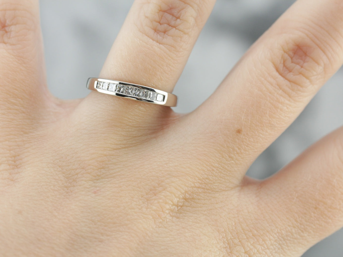 Crafted of polished white gold, this vintage band has a very rich feel and a wonderful, sophisticated profile. Channel settings never go out of style! The effect of one long row of diamonds, one band of glittering bright light, across the finger is always popular and always lovely. The sides of the ring completely encase the diamonds, keeping them safe and secure, which makes these rings easy to wear every day!