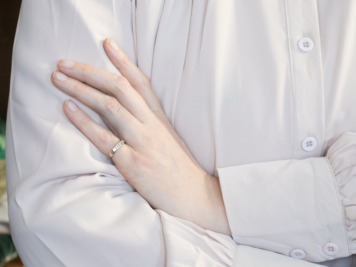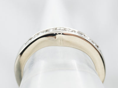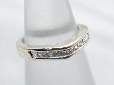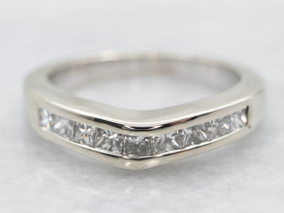 With a center curve, this diamond contour band is designed to sit against a solitaire ring to add beauty and sparkle. The diamonds are bright and glittering, extending into the profile of the ring, and perfectly paired with the polished 14-karat white gold!