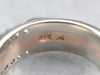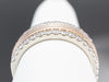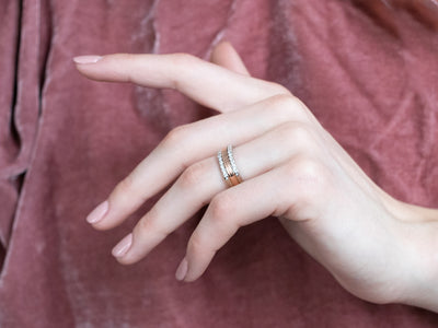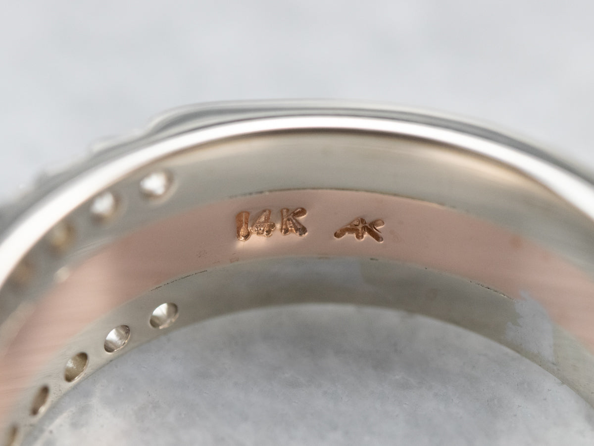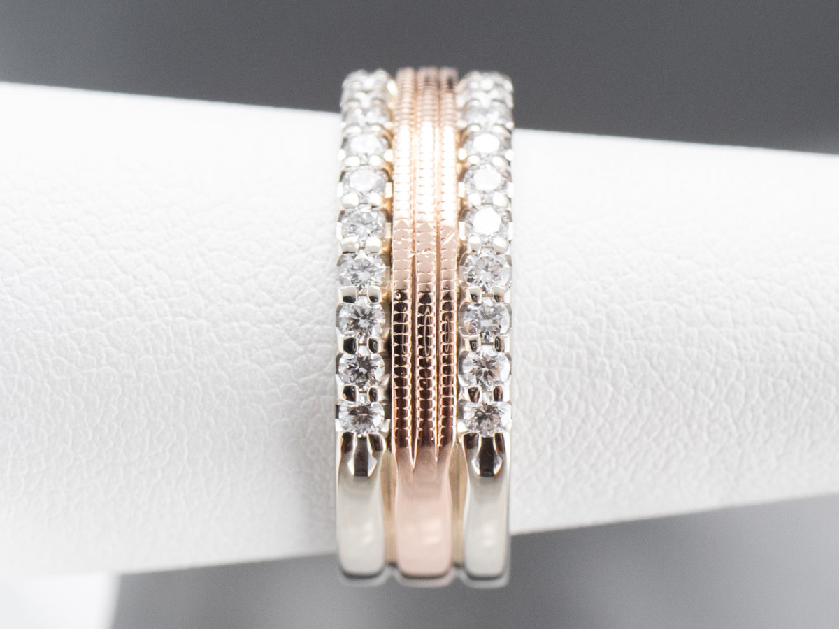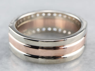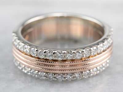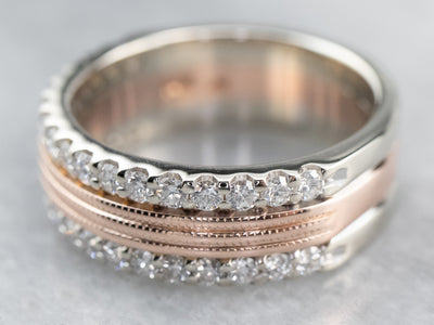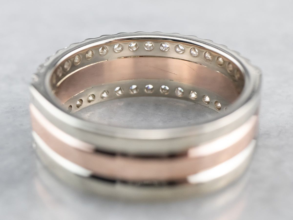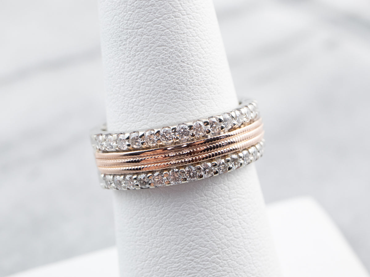 This diamond band would make a lovely wedding ring or an everyday stacking ring! A unique pairing of white and rose gold, this color-blocked design is sophisticated and stylish. Two rows of diamonds form glittering displays of eye-catching light!