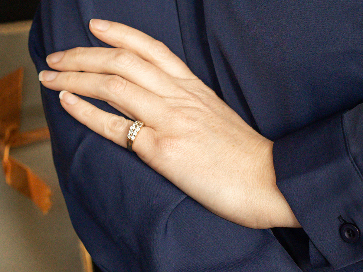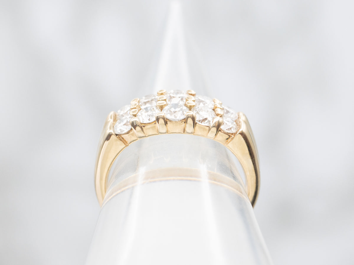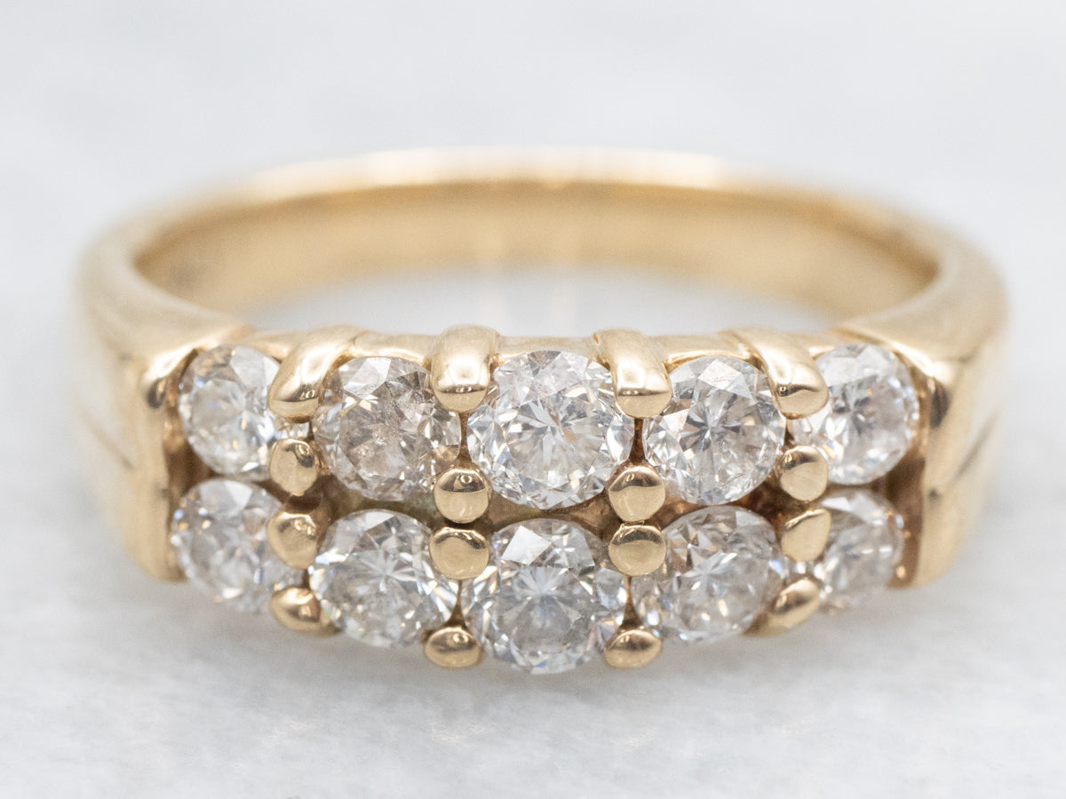 This is a lovely double row of pretty sparkling diamonds, securely set in polished yellow gold. Furthermore, the shape of the band matches up well against a variety of engagement rings or stacked alongside other vintage bands!