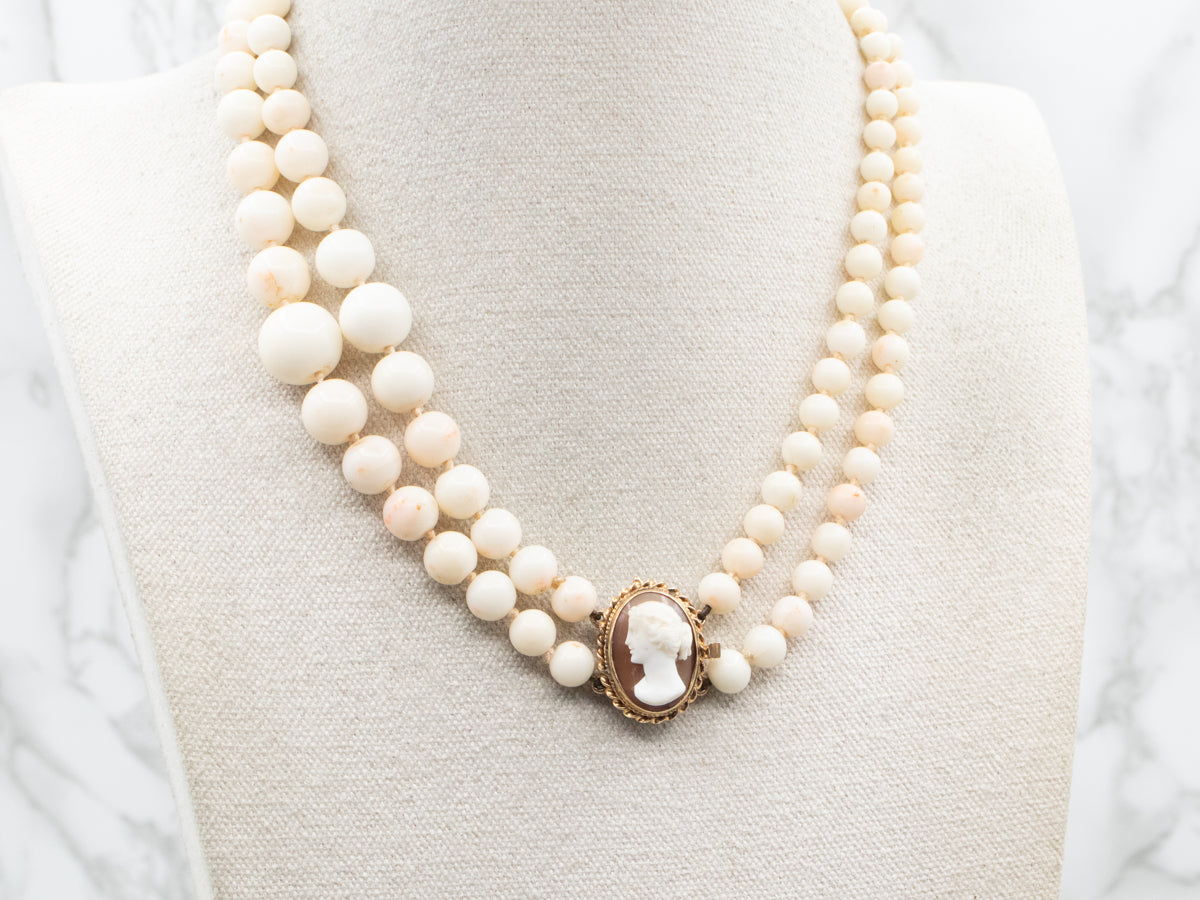 This elegant double-strand coral necklace features a graceful shell cameo clasp and a beautiful baby pink coral beads. This timeless piece is perfect for adding a sophisticated touch to any wardrobe.