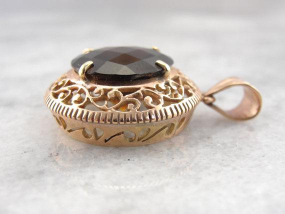 This filigree pendant is set with dravite tourmaline, a variety of tourmaline known for its deep, hazel-brown color and rich sparkle. This particular gem has plenty of forest green in its depths! Perfect for everyday wear, this unique piece has a lovely character!