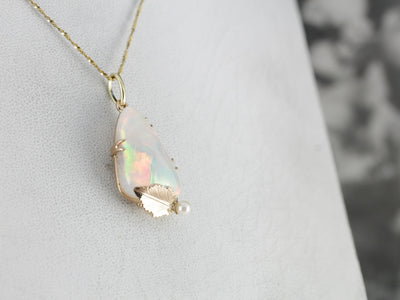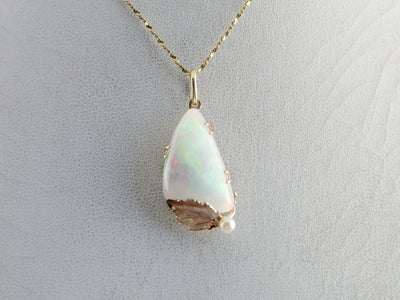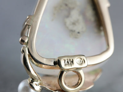 This nearly clear and yet supremely reflective gem! Opals are intense: pinks and oranges, glowing greens and spangles of purple and peach. We've set this exceptional gemstone into a fitting frame, a handmade, one of a kind gold work that incorporates dreamy pearl and golden leaf from the Retro Era.