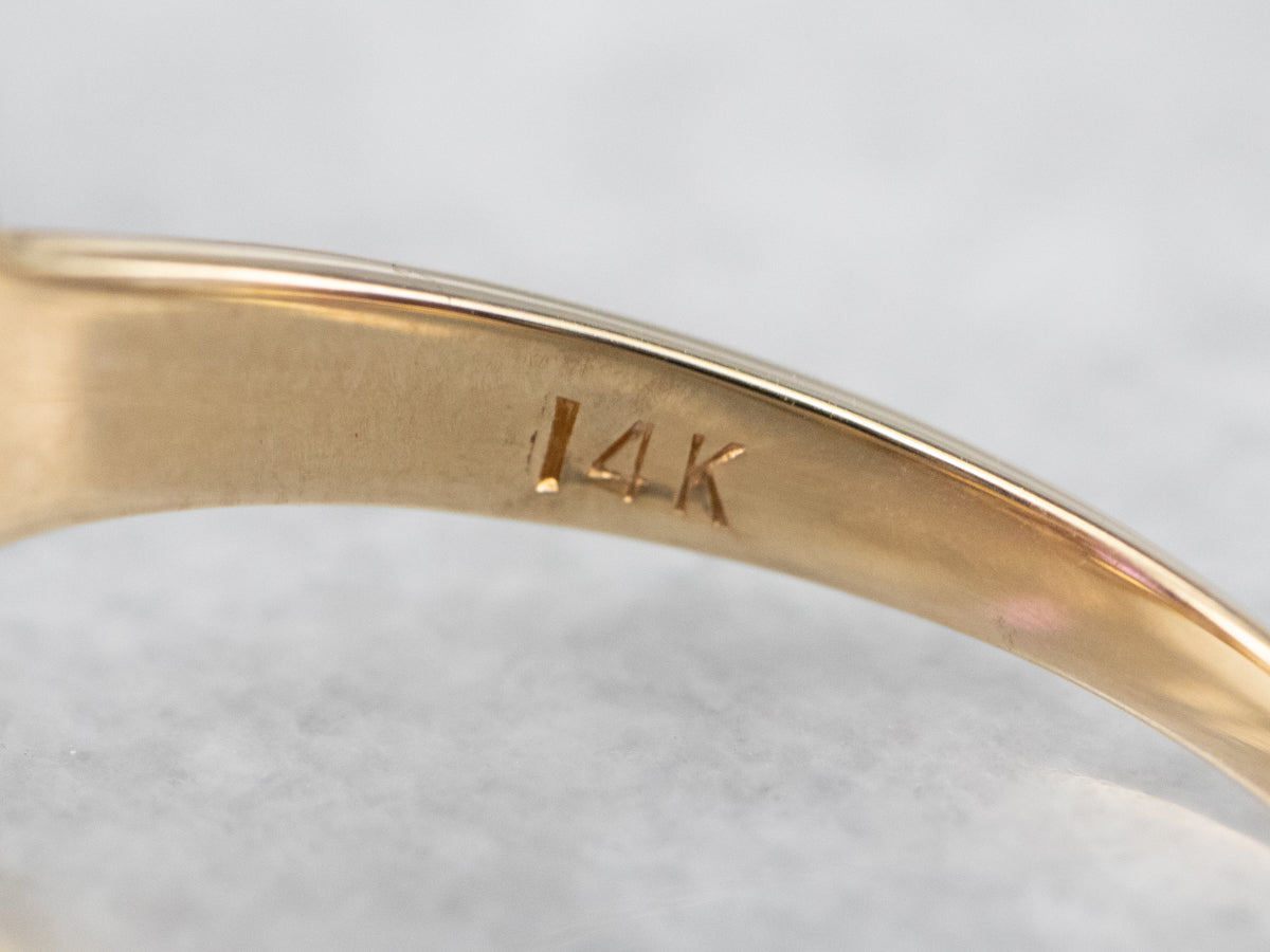 Glamorous and glowing, this vintage ring features a substantial style to the mounting, with diamonds glittering in a halo around the center stone. Pretty and polished, this ring balances out the eye-catching, oval-cut amethyst on the top. All in all, a gorgeous vintage piece that is certainly one-of-a-kind!