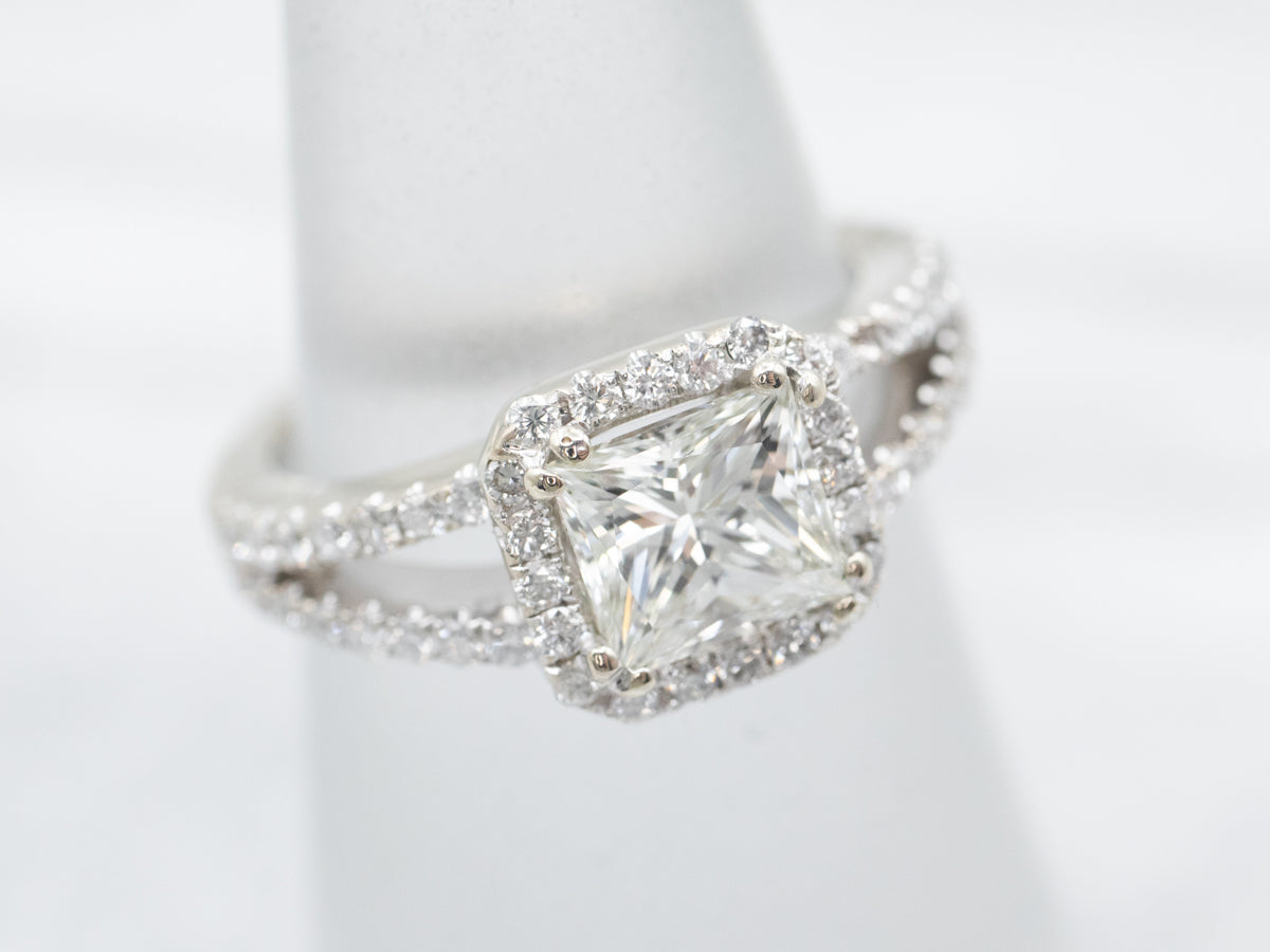 Although thoroughly modern, the slim lines and diamond-encrusted aura of this setting have a definite Edwardian Era aura! Glittering from every angle, the small size of the accent diamonds keep the piece from being ostentatious, instead simply accenting the beauty of the stunning modern princess cut center diamond. A wonderful combination of classic lines and contemporary style, this lovely ring will make a wonderful engagement piece for a lady who loves glitter with sophisticated air!