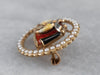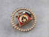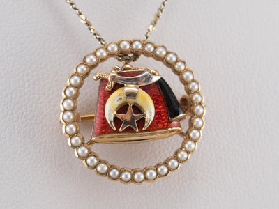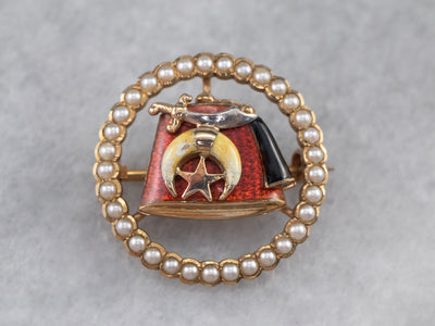 This beautiful antique lapel pin is centered with the iconic Shriners symbol! Enamel accents add beautiful colors to the piece, while the halo of seed pearls frames the emblem with classic sophistication. The design of the pin allows for a fine chain to be threaded through the back so you can wear it as a pendant as well.