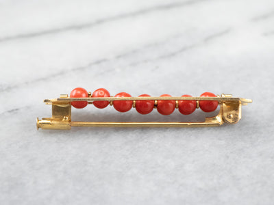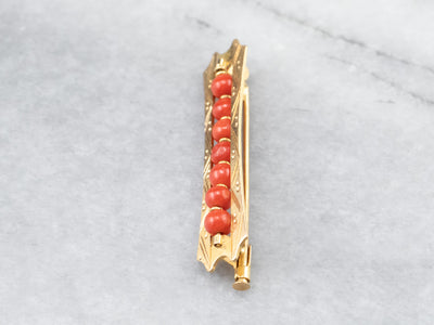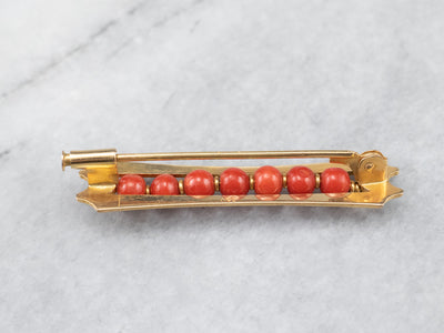 This antique coral brooch is in exquisite condition considering its age, the coral beads are threaded in between golden rings, the engraving crisp and clear, a stunning example of high-end Victorian era jewelry, a perfect addition to your estate jewelry collection!