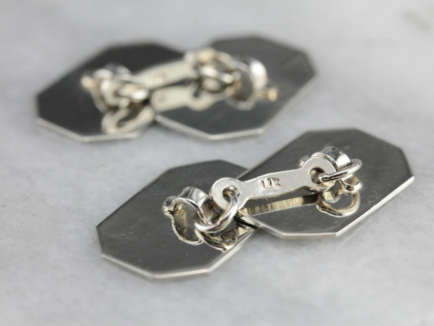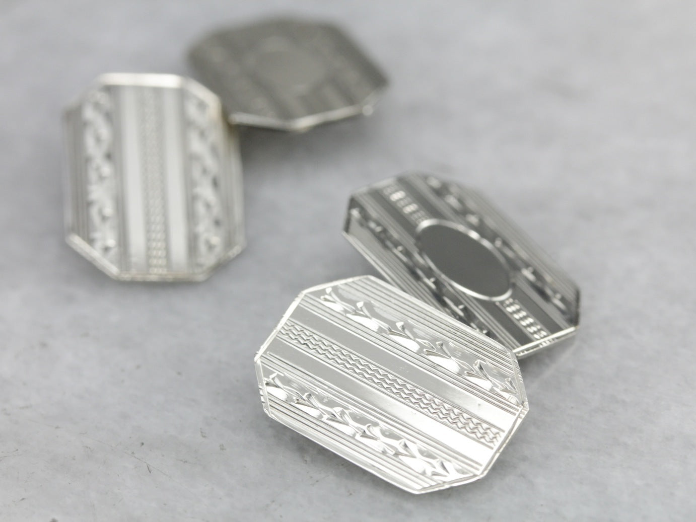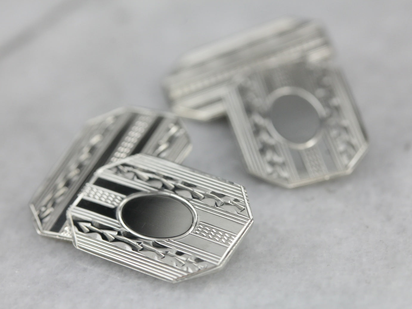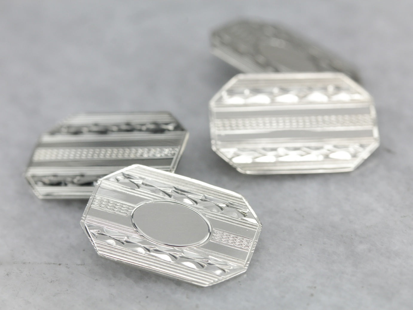 These Art Deco era cufflinks are the very definition of sophistication. The metal is bright white gold, worked in a handsome Art Deco motif, with a small oval ready for engraving, perfect for the groom, these cufflinks are ready to wear or give as a gift!