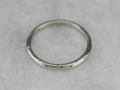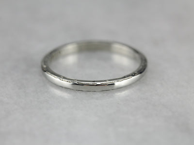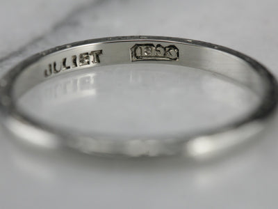This shining vintage band is crafted from the highest quality materials: 18 karat white gold, with a lovely patina. Weighty on the finger, comfortable and substantial, this simple piece is an excellent choice for a lady who wants one, simple, elegant ring.