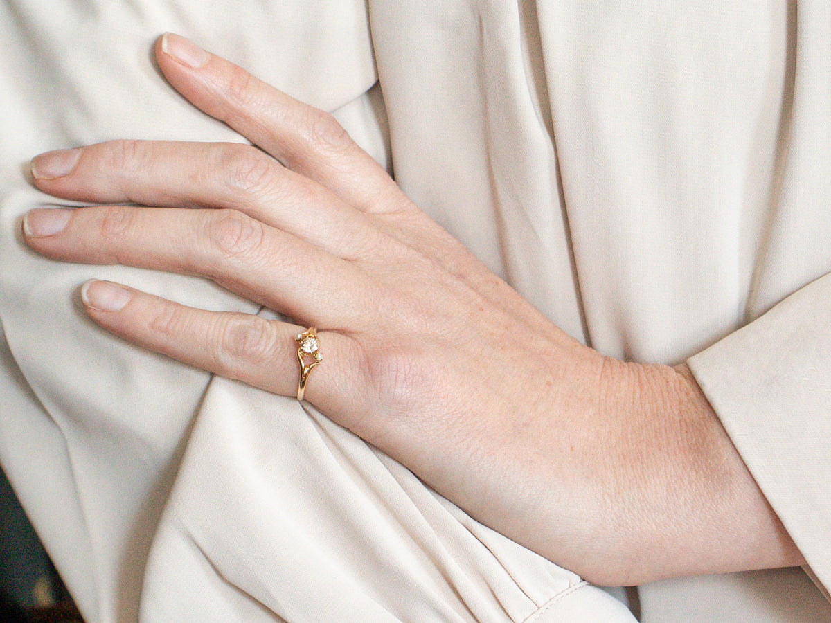 Old-cut diamonds hold a special place in our hearts here at Market Square Jewelers, and this vintage piece truly made our hearts skip a beat! Set with a lovely European cut diamond, this bypass-style band is crafted of warm 10-kart gold and set with creamy seed pearls. Worn as a birthstone, right-hand ring, or as a unique engagement piece, the timelessness, and beauty of this ring will shine on for decades to come!