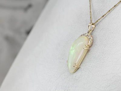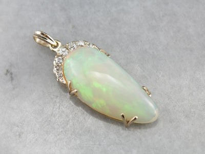 One of the highest quality stone we've had the opportunity to work with, we've set this into a unique, mixed era mounting of fine gold, inlaid with gorgeous high-quality old mine cut diamonds. Suitable for an omega necklace, collar, or fine chain, this collectable piece will transition well from office to cocktail party!