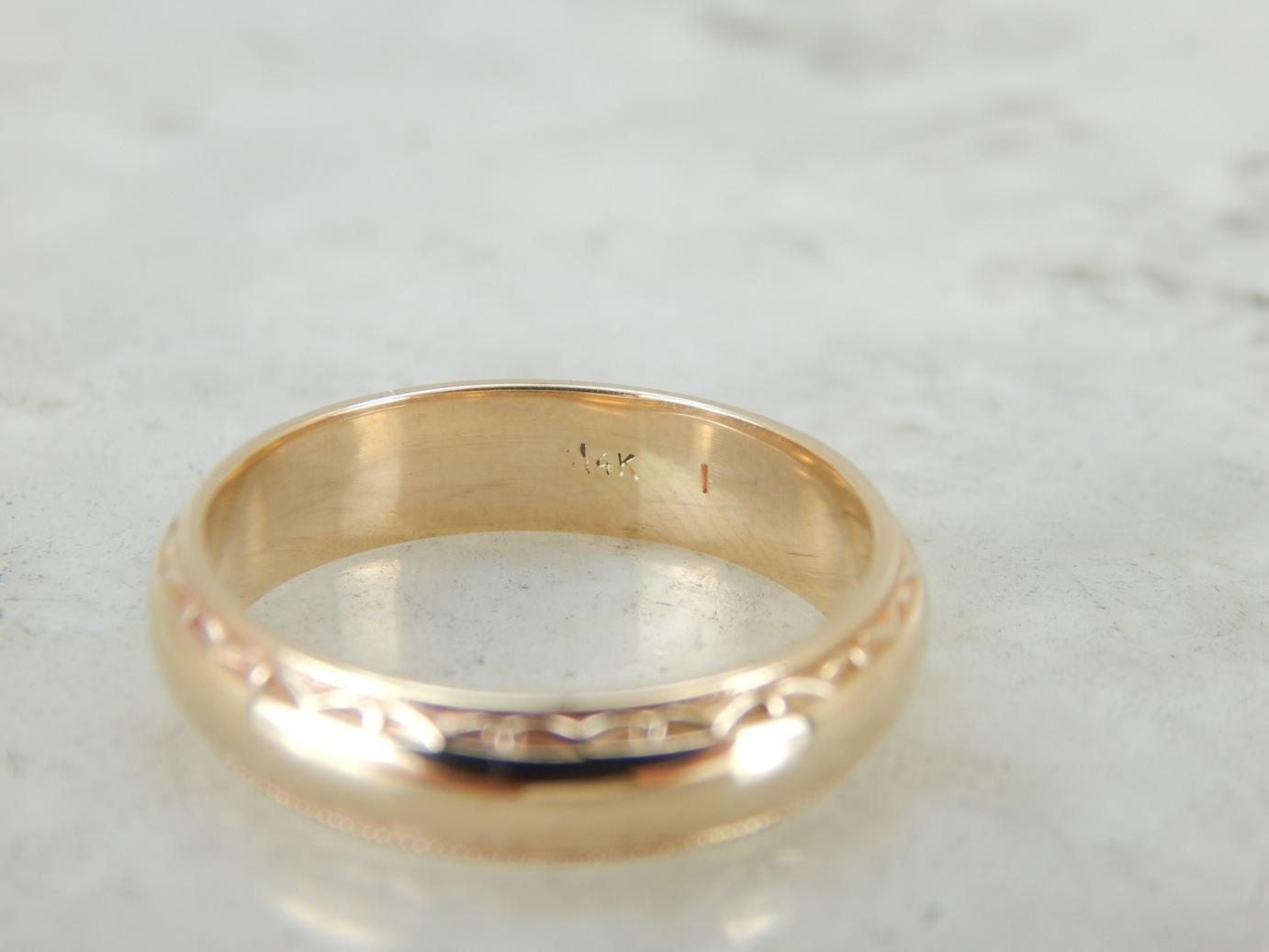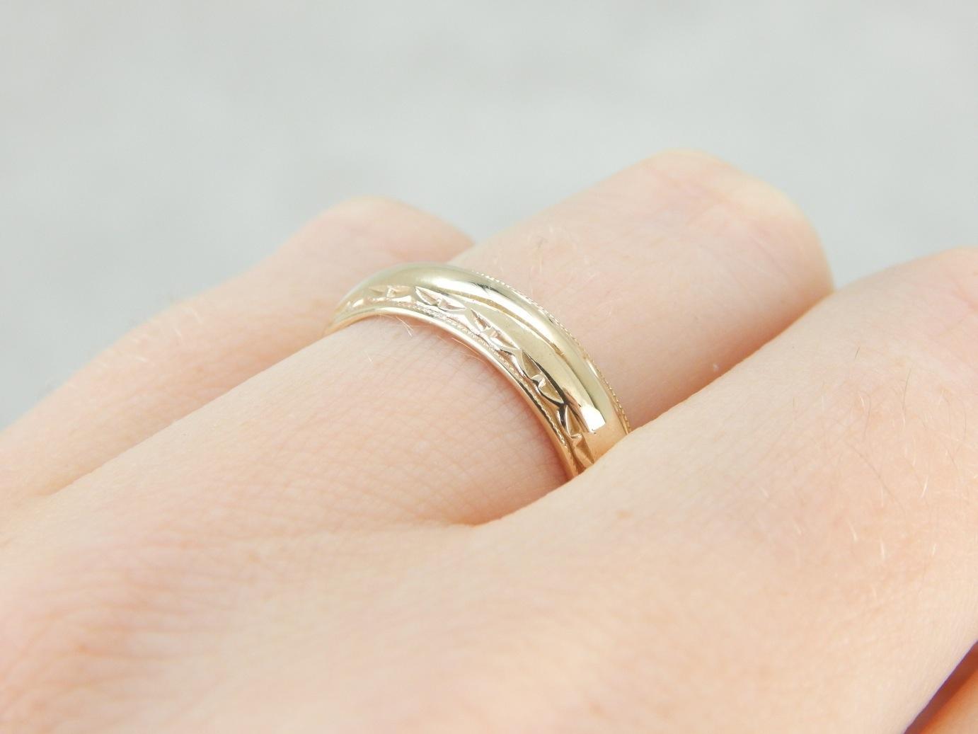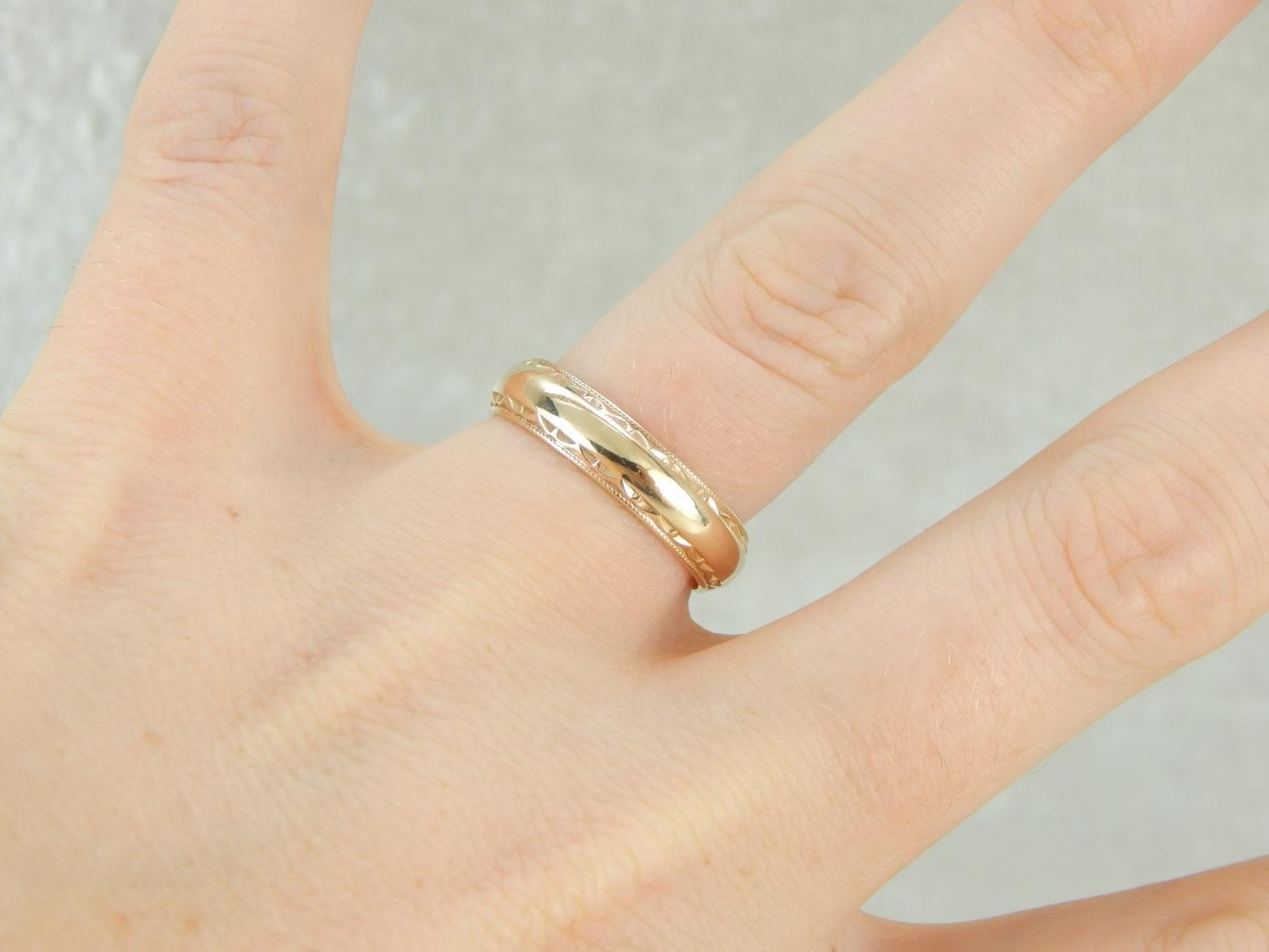 This vintage wedding band is unusual, and very pretty! The combination of decorative elements and smooth, polished gold means that this piece will go well with a variety of engagement pieces!