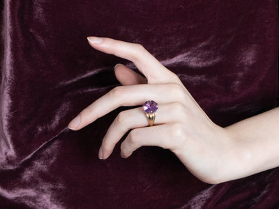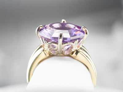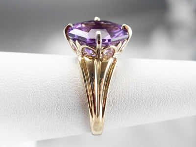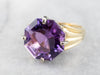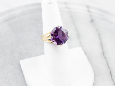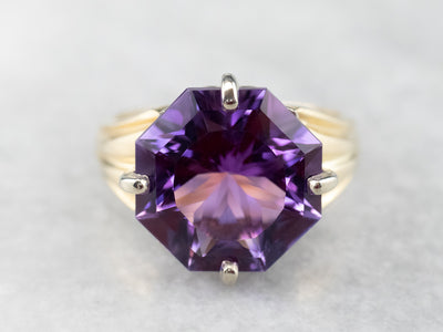 Outstanding! This solitaire cocktail ring is all about the gemstone. One, simple, solitary gem, set up in the modernist style. The clean geometric lines of this fancy cut allow this wonderful amethyst to sparkle with undertones of regal purple and raspberry, we've set this stone into a simple two-tone gold mounting creating a sophisticated statement piece!
