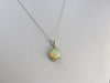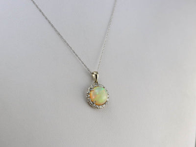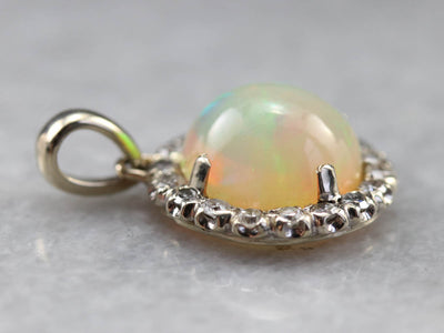Every color of the rainbow seems to spark through this beautiful opal, depending on the direction it's viewed from. Truly fine in clarity and perfectly cut and polished, this opal has a luscious feel, as though the green, orange, pink and even blue sparks were caught in a pool of liquid light. This combination of opal and fine, sparkling diamond halo, creates a look suitable for any occasion!