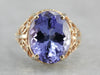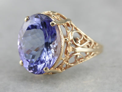 We've taken this vintage, filigree cocktail ring and set it with an outstanding tanzanite! The yellow of this lovely gold ring is the perfect accent to the deep blue purple of the gemstone. The two colors accent each other perfectly! The filigree also allows plenty of light into this sparkling tanzanite.