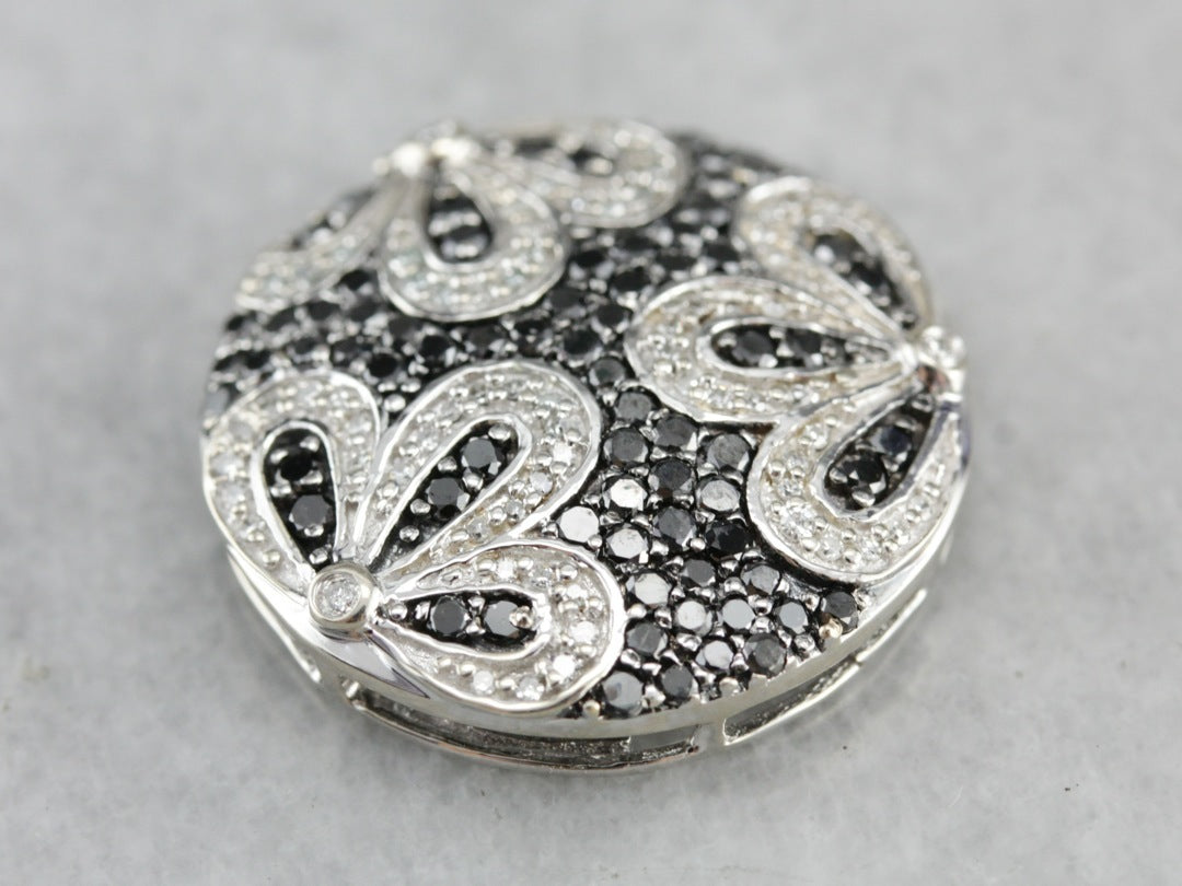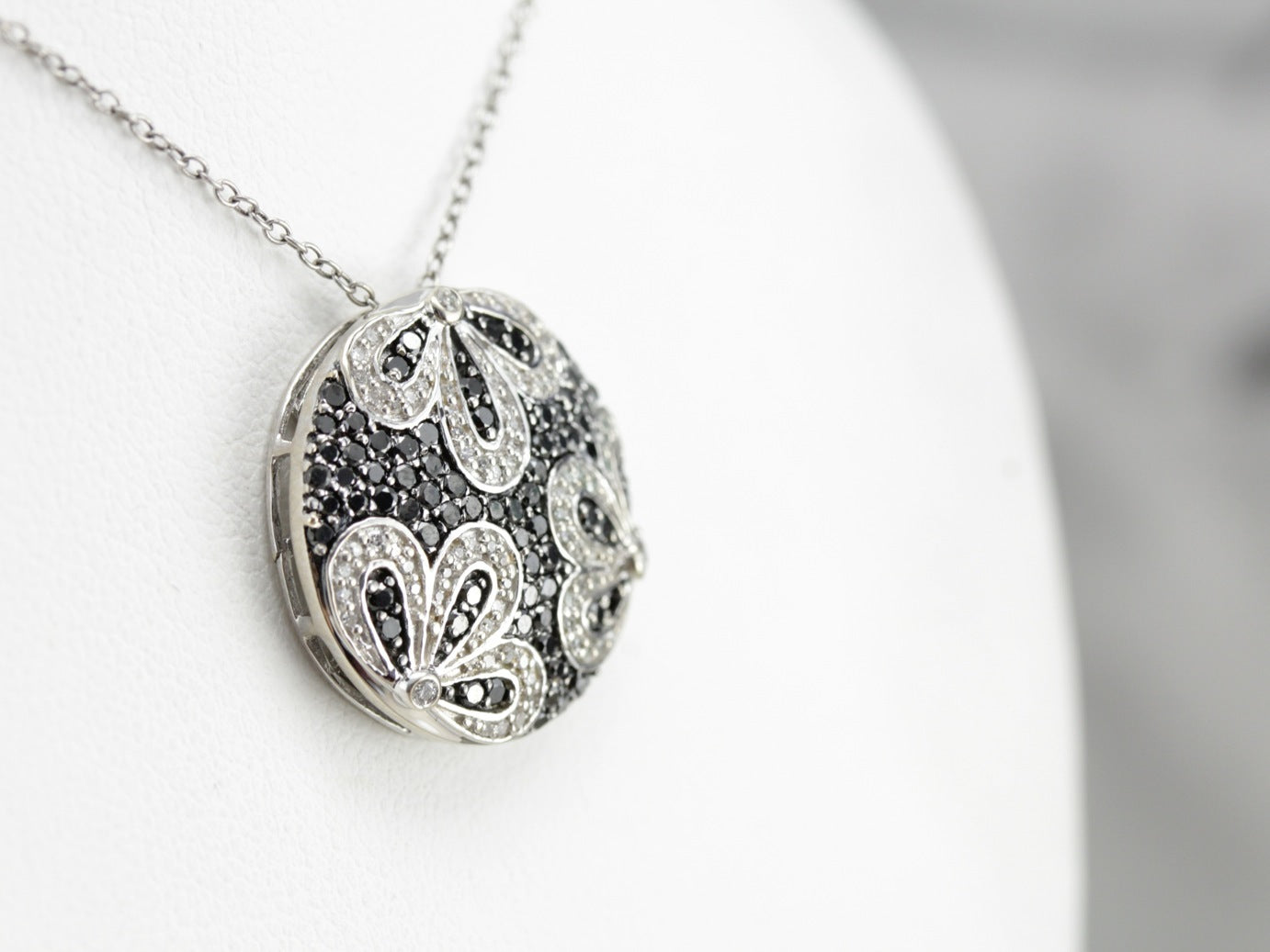 This vintage pendant would make the perfect anniversary gift, or even as a wedding day gift! Crafted of white gold, the black and white diamonds are set in the center of this simple circle slide in a floral design with amazing glitter!
