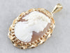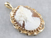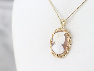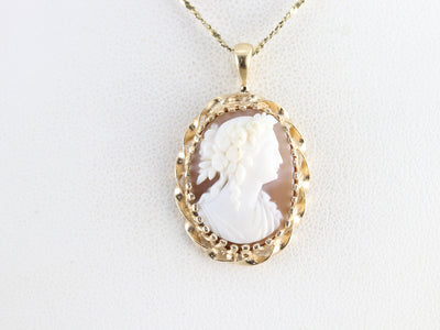 We've converted a vintage brooch into a lovely cameo pendant! The cameo itself is beautifully carved from shell, with the details of the roses in the woman's hair standing out in particular. A simple frame of twisted gold provides an elegant compliment to this exceptional cameo.