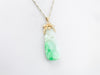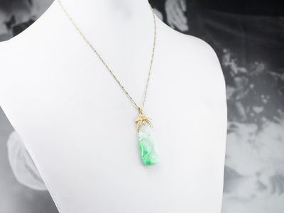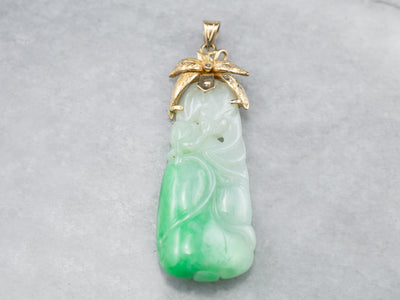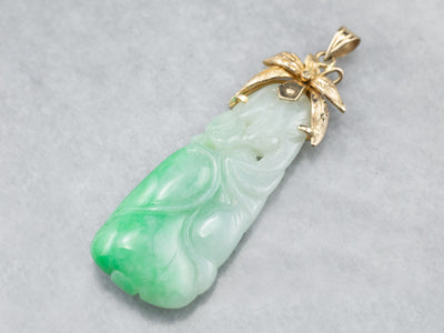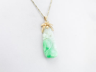 Dating to the 1960s or 1970s, this vintage pendant has a fantastic shape. The sweeping floral motif at the top is a lovely counterpoint to the long teardrop of the jade. Soft green with highlights of white, this jade has been carved with a floral motif, and even has tiny piercings that go all the way through! These provide small dots of light in the stone when the pendant is worn!