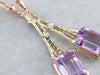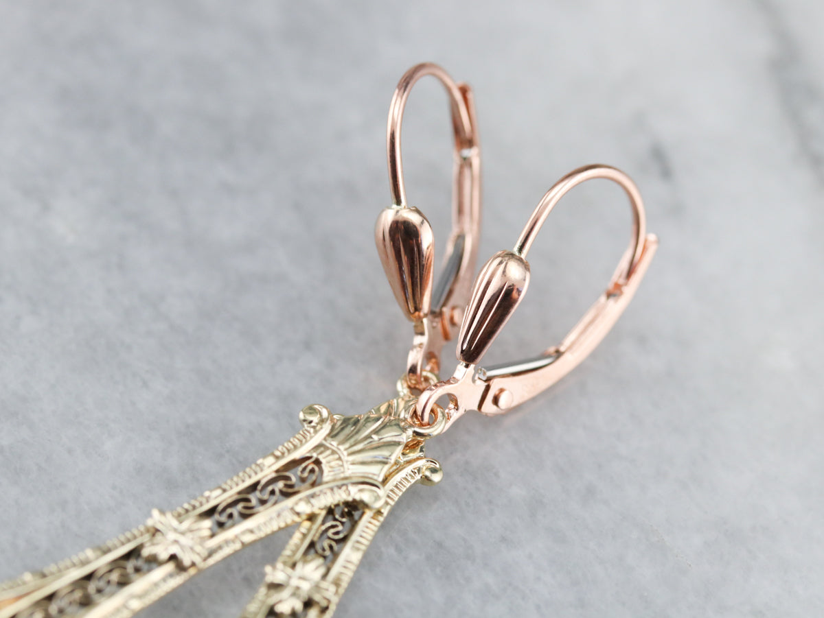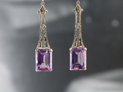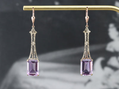 We created these unique, one of a kind earrings using elements of a filigree Art Nouveau bar pin from the early 1900's. Polished yellow gold forms a distinct floral filigree, unique and absolutely gorgeous! Well balanced and sensual, these pretty pieces are finished with light purple amethysts that give the jewelry a sophisticated flair. Finished with comfortable rose gold lever backs, these stunning drops are ready to wear or gift!