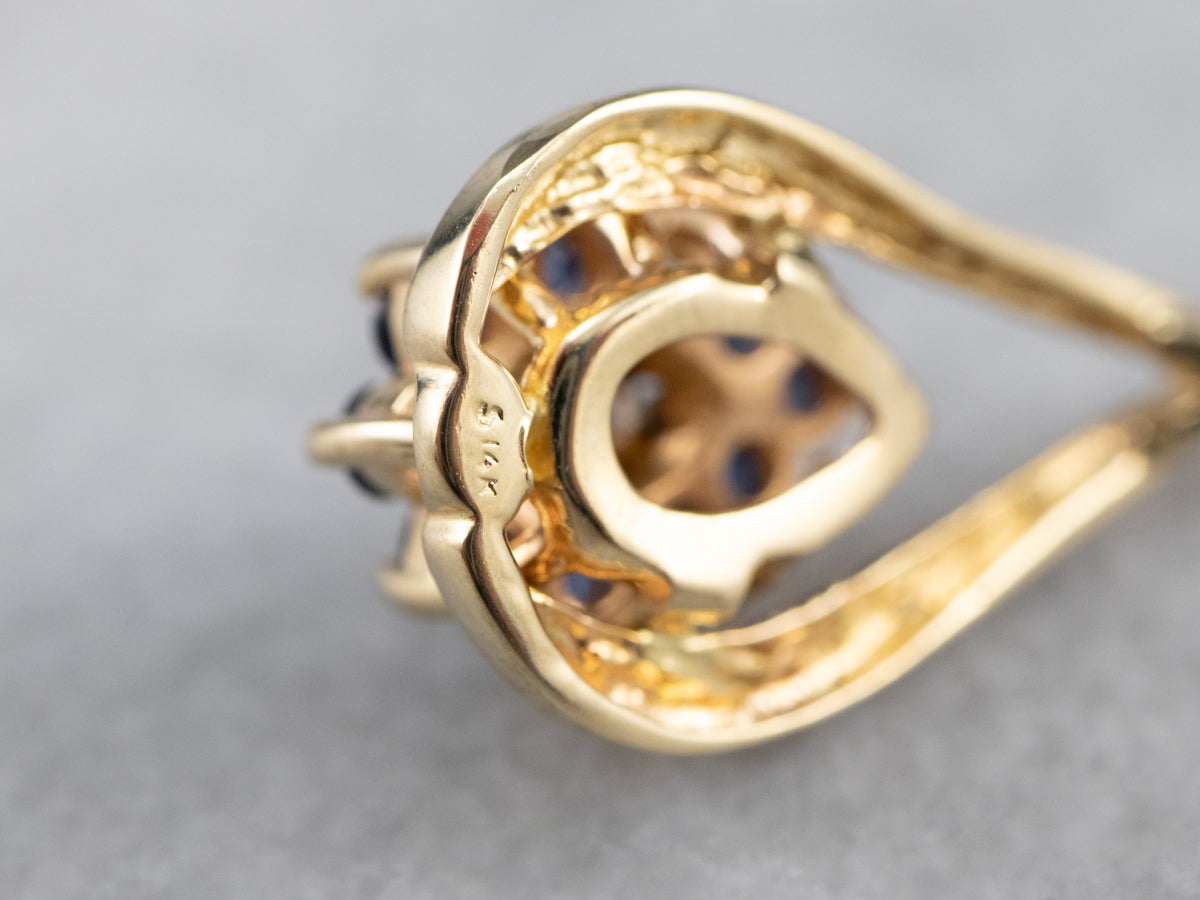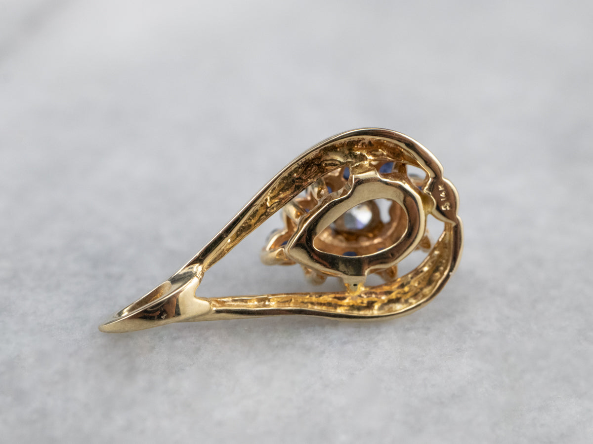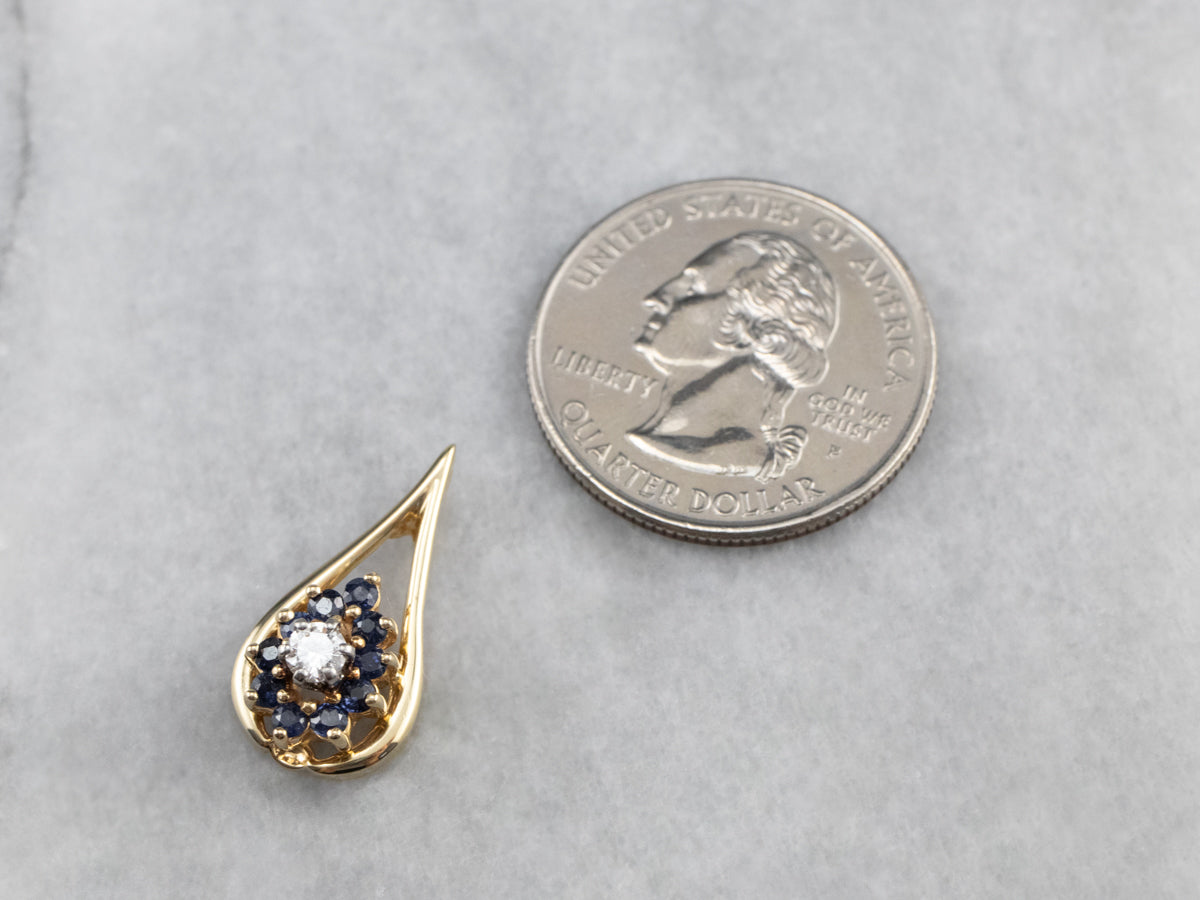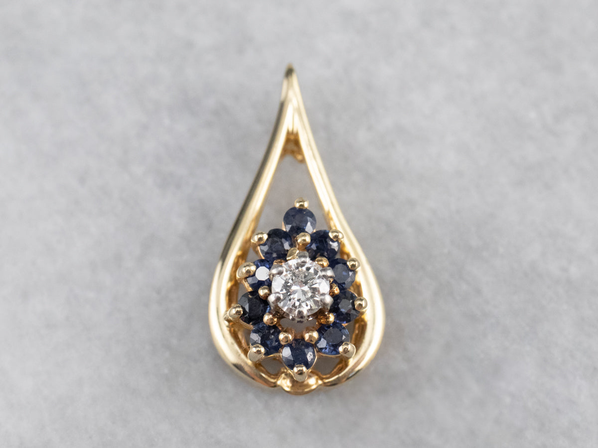 This sweet halo pendant is feminine and delicate looking, but more than strong enough to wear every day! The center is a bright diamond, surrounded by perfectly blue sapphires. All of the stones are mounted in their own prongs, very secure and safe!