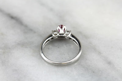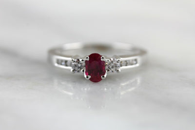 Perfectly proportioned to be worn with wedding bands, anniversary rings or stacked any way you choose! This modern era mounting has been set with a ruby of the juiciest shade of red, and some seriously sparkling diamonds!