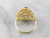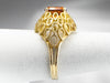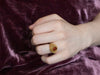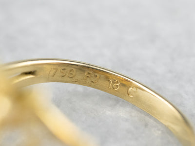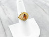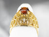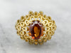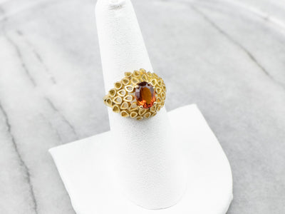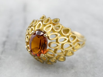 This funky 18 karat gold frame of this vintage mounting has a bit of a pinwheel or honeycomb effect, presenting a larger profile on the finger, and yet still very light and airy! Set with an oval-cut citrine, the warmth of this stone anchors the ring, drawing the eye to the carousel style center.