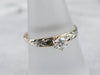 This lovely vintage solitaire has a slightly victorian gothic style to it! Crafted of both white and yellow 14 karat gold, this ring features a sparkling round brilliant diamond and a beautiful black enamel botanical motif!