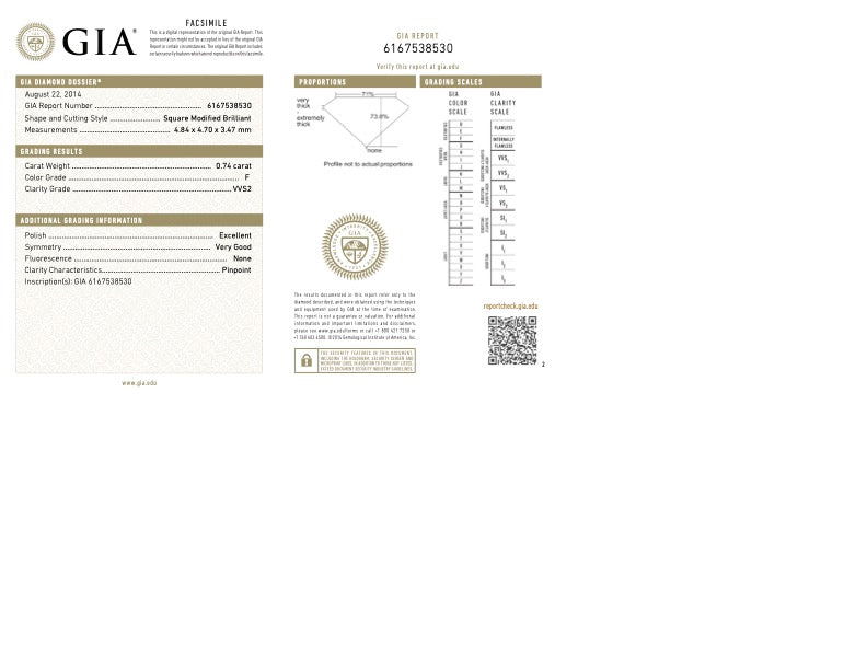Metal: 14K White Gold Gem: Diamond .74 Carats, VVS2 in Clarity, F in Color Gem Measurements: 4.8 x 4.7 mm, Square Princess Cut Ring Size: 7 Marks: "14K" Stamped on the inside band GIA Report #: 616********