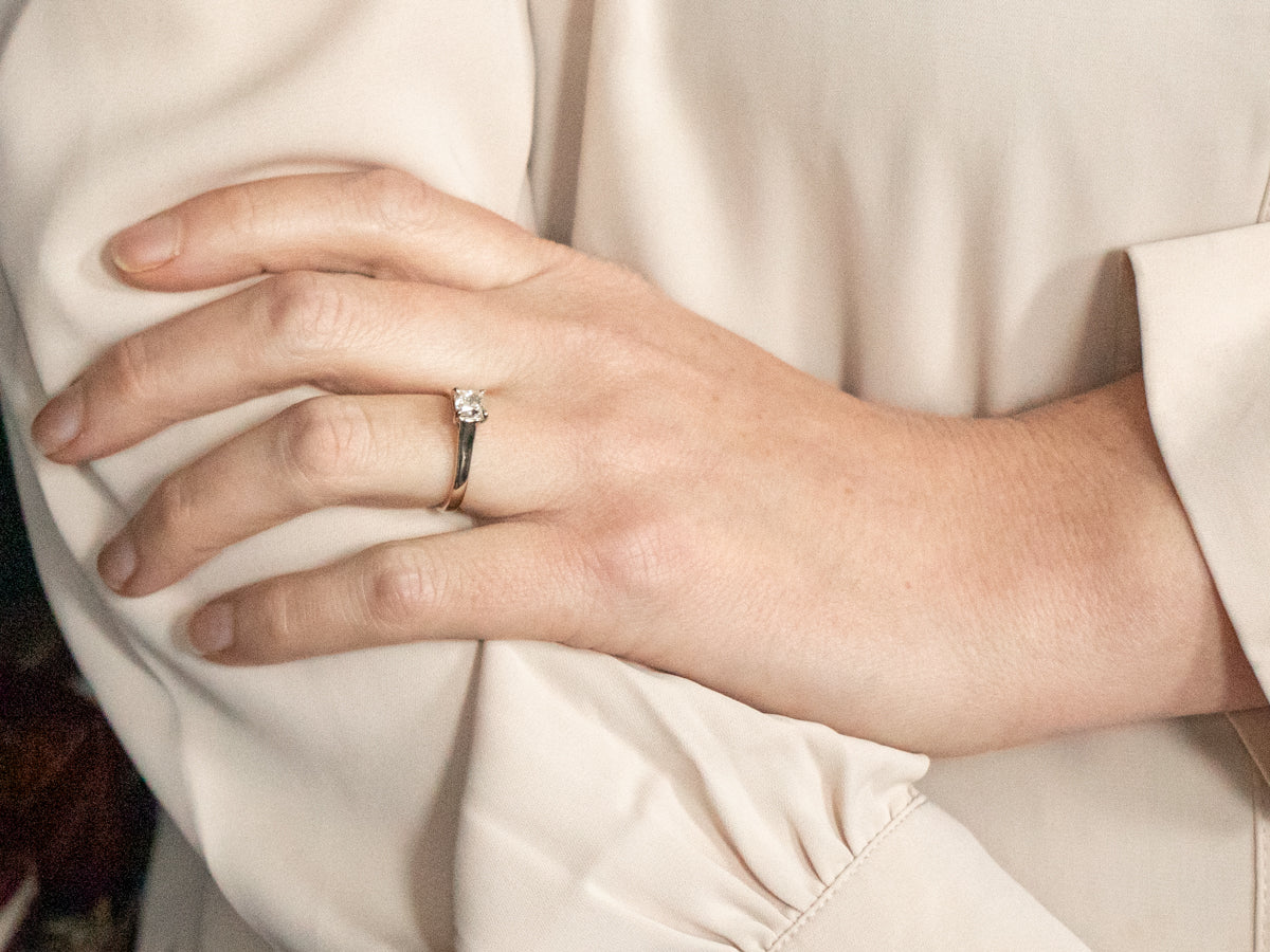 We've set this classic mounting with a newer GIA-certified diamond, a Princess Cut stone that glitters with a sleek, sophisticated fire.