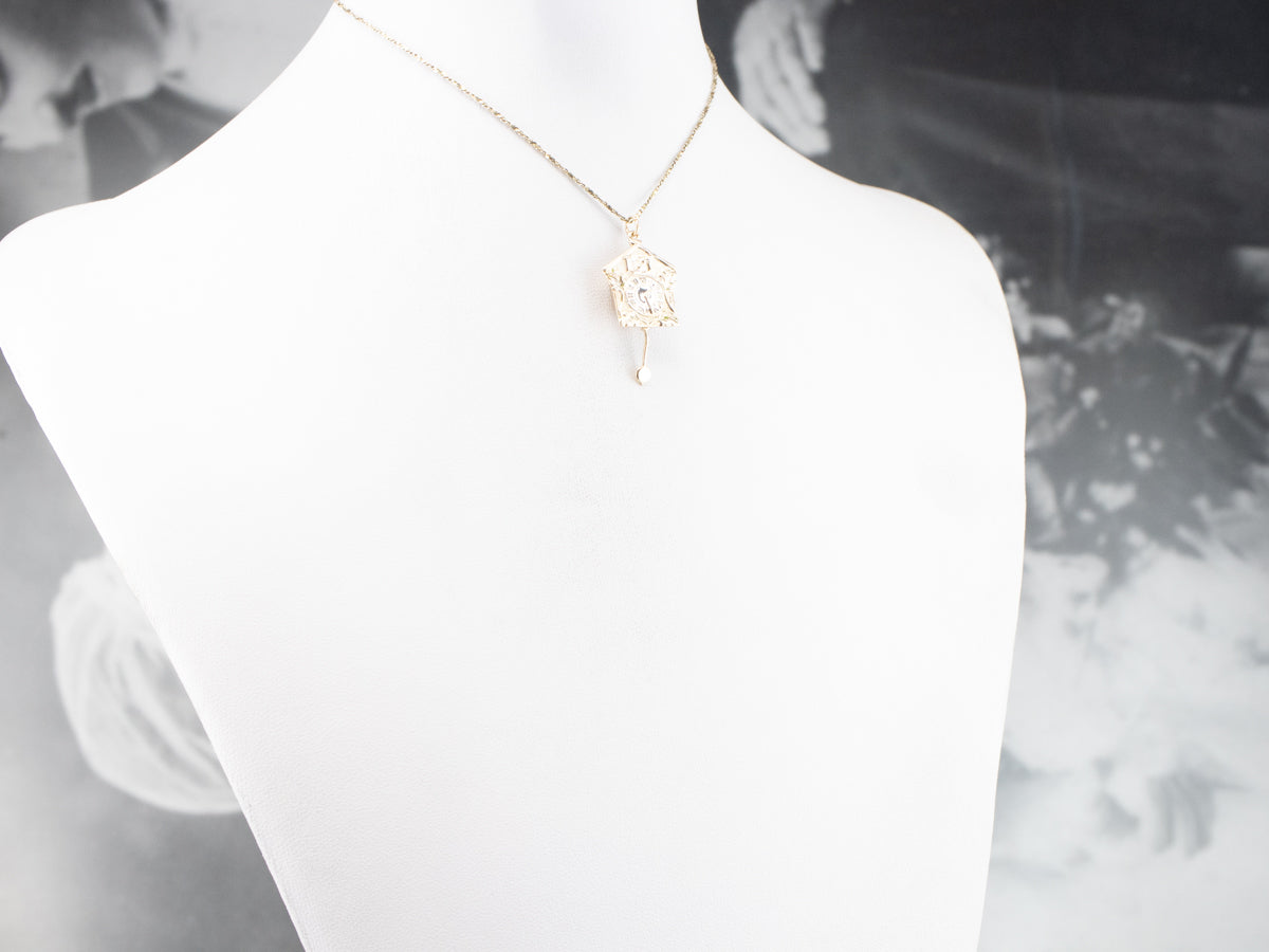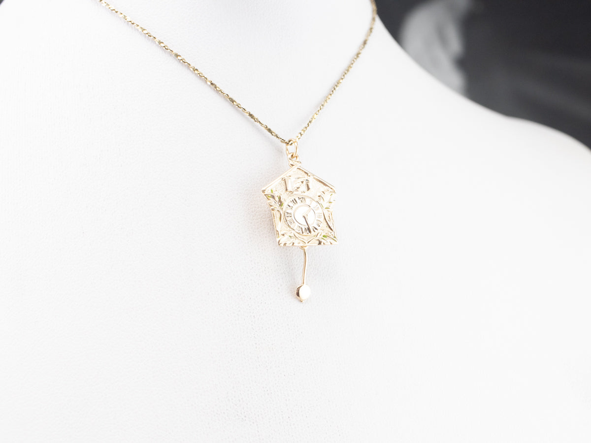 Filled with small details, this vintage piece can be worn as a pendant or a charm. The small leaf pieces on the edges of the clock and the swinging pendulum make this a particularly attractive piece!